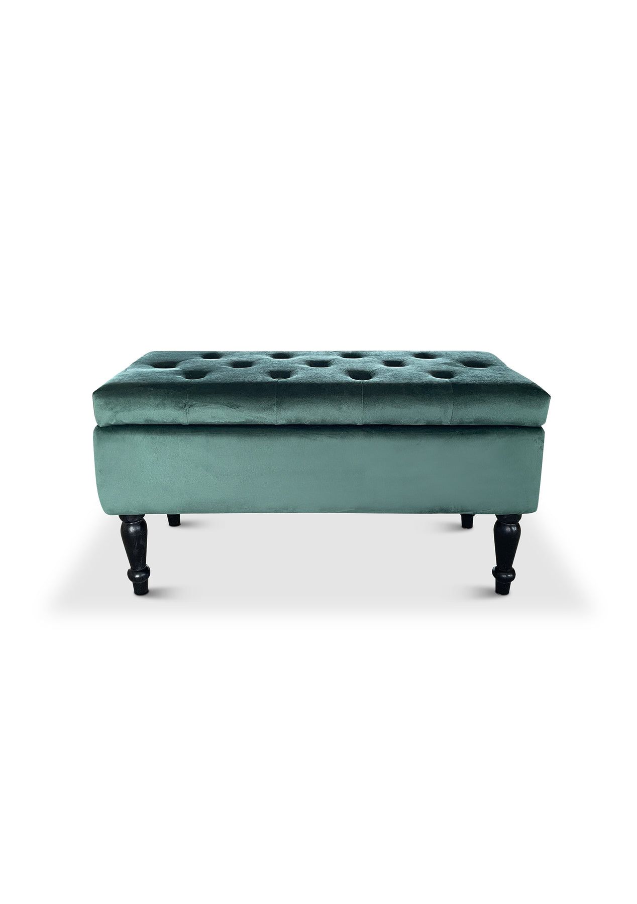 PR9574 Lettice Storage Ottoman Bench Velvet Green With an elegantly tufted seat and finished in elegant velvet, our ottoman is simply luxurious to rest on and adds a plush touch to any home. But more than that, it also provides neat storage space for your home essentials. Blankets, throws, pillows, magazines, and even toys can be stowed away in a discreet, easy-to-access manner. Made of quality material, the ottoman is strong and sturdy and stands up to durable use. The lift-up top enables easy access while its robust metal hinges ensure that it will stay open and not falter easily. Whether you are using the ottoman as extra lounge seating, bedroom décor, or your favorite footrest, our multi-functional and versatile ottoman matches form with function perfectly and elegantly. FeaturesCan be used as seating, footstool, and storageGenerous storage spaceSturdy wooden constructionHigh-density foamLift-up lidRobust metal hingesWooden legsSpecificationsFrame material: PolywoodSeat material: velvetOverall dimension: 78 x 37 x 40 cmColor: GreenSimple assemble required.