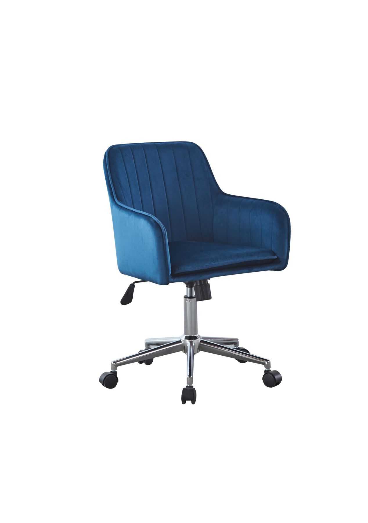 PR8552 Artechwork Home Office Chair Blue Beautifully upholstered Office Chair with trendy color velvet fabric make the chair smooth and comfortable. Simple curved outline but still generous and elegant look Office Chair will be a gem in your contemporary design home or office. The height adjustable gas lift mechanism allow Office Chair seat height from 47.2cm to 59.5cm and wheeled 360 degree swivel base provides practicality, whilst the curved back and arms give it a maximum comfort for Office Chair. == Office Chair Feature ==* 360 degree swivel recliner Office Chair creating easy movement* Wrapped in trendy color velvet upholstery* Curved contours design perfectly fit body shape Office Chair* Padded seat and back for extra comfort Office Chair* Removable seat cushion * Constructed with Chrome base with nylon castors for stable* SGS certified 2 level pneumatic rod* Adjustable seat height from 47.2 to 59.5cm * Easy assembly * Weight Capacity: 180kg == Specification ==* Color: Deep Blue* Material: Velvet fabric, foam, steel leg with class 2 & Nylon wheel* Size: W55.5*D59*H81.3-93.3cm * Seat Hight: 47.2 -59.5cmPackage Dimension: 59 x 59 x 47CM