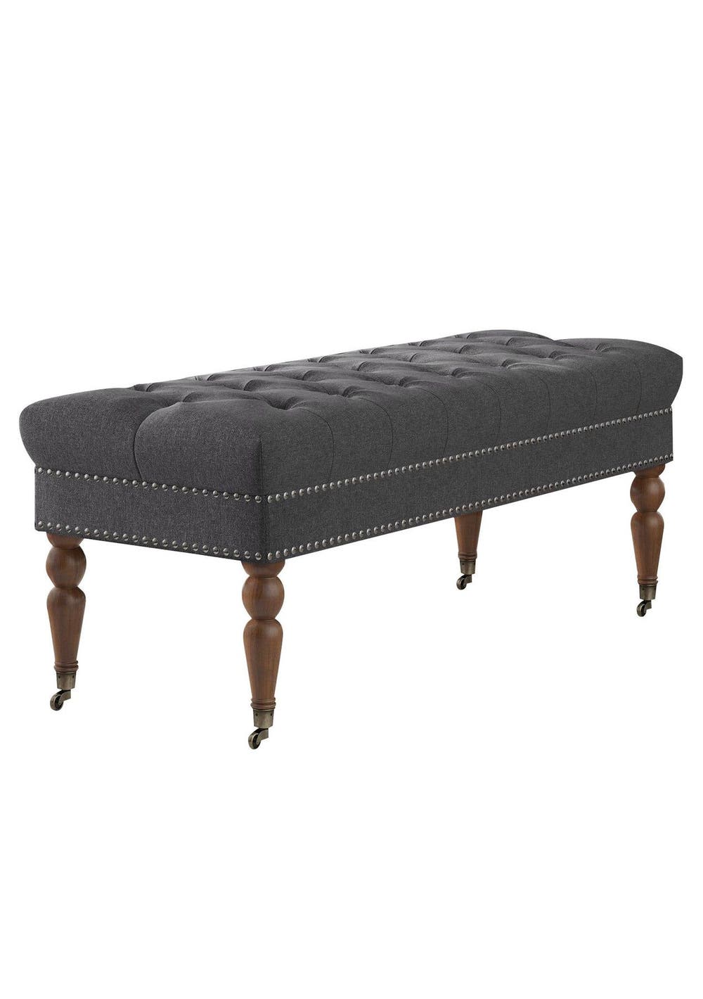 PR9104-Bellay Ottoman Bench Linen Dark GreyAlmost like a piece of art, this ottoman fuses mid-century modern design with a classic silhouette and slanted wood legs for an impeccable finish. The soft linen upholstery brings in luxury, while the tufted button top with a double row of gleaming nailhead trims pulls in decorative elements to enhance your decor. The casters wheels make it easy to move from room to room. Use it as a soft cozy seat beside your bed or as a coffee table in your living or entertainment area, this ottoman bench delivers great functionality and lovely accents to several spaces in your home.FeaturesElegant faux linen fabricTufted nailhead trimsUltra-soft cushioned seatSleek edgesSolid wood legsMoveable with caster wheelsEasy assemblySpecificationsMaterial: wood+linen+foamColour: dark greyDimension: 120x49x46cm