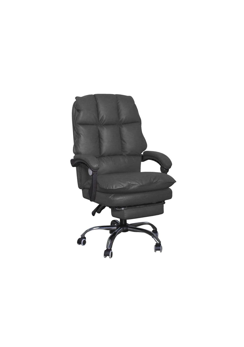 PR9528 Tianna Executive Office Chair PU Black Description:Allow our executive office chair to make your sitting and working experience more comfortable and productive. It has a nicely padded, soft PU leather seat, back and armrests with top stitching. The backrest can be adjusted and locked at different angles to suit your activities such as working, reading, viewing videos or just resting, with a retracted footrest. 360° free swivel feature allows you to turn in direction and collaborate with your colleagues. Smooth-rolling casters mean you can take this chair anywhere for greater convenience and mobility. The sleek frame and modern design make this executive chair an elegant addition to your home office or study.FeaturePU-covered padded topPP armrestsHeight adjustment360° rotatable seatOptional retracted padded footrestMetal base5 dual-wheel castorsEasy assemblySpecificationsColor: BlackWeight capacity: 150kgOverall Dimension: W63 x D65 x H112~122 cm Min to max seat height-50cm-60cm Package Dimension: 70 x 58 x 35CM