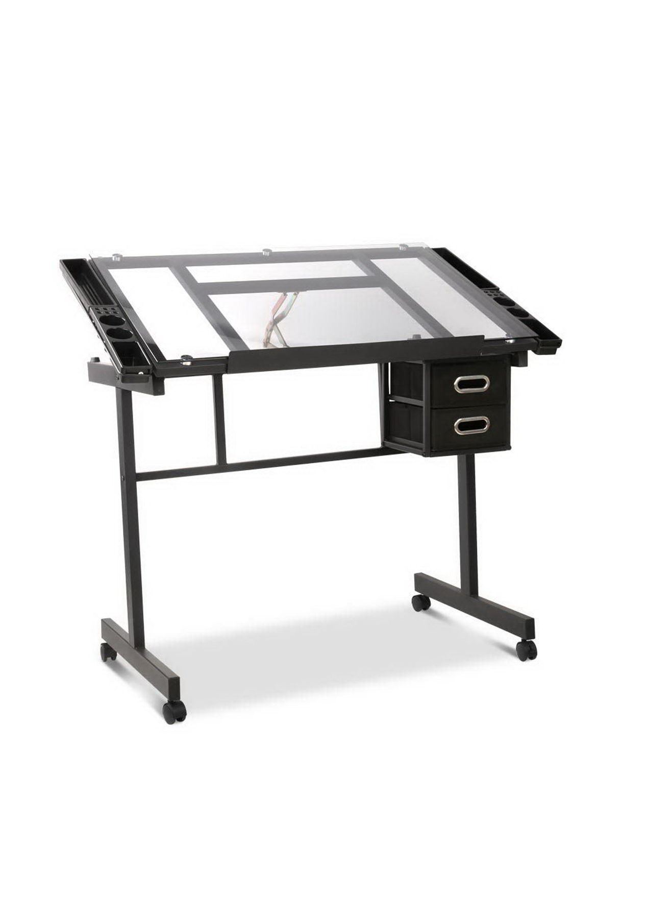 PR71985Every artist and draughtsperson needs this. The all-new Drawing Desk that let you creates your inspired works in a comfortable and practical setting.With its pencil-edge tempered glass desk top, the Drawing Desk is assured of safe use with utmost transparency. The removable side trays and drawers also help to provide useful assistance with all your working and drawing essentials storage. As to the frame, the black powder-coated finish steel-constructed structure is designed to be durable and steady while the four castors, including two with locks, allow you to move the Drawing Desk easily. Not least, the adjustable desk top lets you set your preferred working angle with equally reliable hardware.All in, the Drawing Desk could be behind some of your greatest works and masterpieces. Get yours today.FeaturesPencil-edge tempered glass desk topBlack powder-coated steel structureApron desk top edgeUp to 60 desk top adjustmentTwo removable non-woven drawersFour removable side storage traysFour castors with two lockingFour extra non-skid rubber feet padsSpecifications:Frame: Power coated steelGlass: 6mm temperedDrawer dimension: 46cm x 31cm x 10cmOverall dimension: 104cm x 60cm x 74cm- 122cmColour: Black frame and grey desktop glass Instruction ManualPackage ContentItem Description: Quantity:Drawing desk x 1Assembly manual x 1