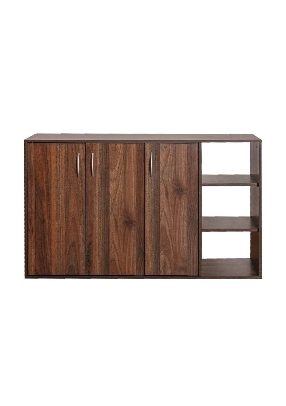 Product ID: PR65036Okura Shoe Cabinet 3 Door WalnutSimple yet functional, this Okura shoe cabinet is made of particle board and constructed with a 3-door cabinet and open shelves. The 3 layers of shelves in the cabinet can easily accommodate at least 9 pairs of adult shoes. Add your favorite decorative pieces on top of it to complete its look. It will also be a lovely spot in your room. ==Specification==Material: Particle board with paper lamination. Product Size: 1063*300*633mmFit for 12 pairs of shoesColor: Columbia Walnut Packaging Dimensions: 115.5x36.5x15.6cm