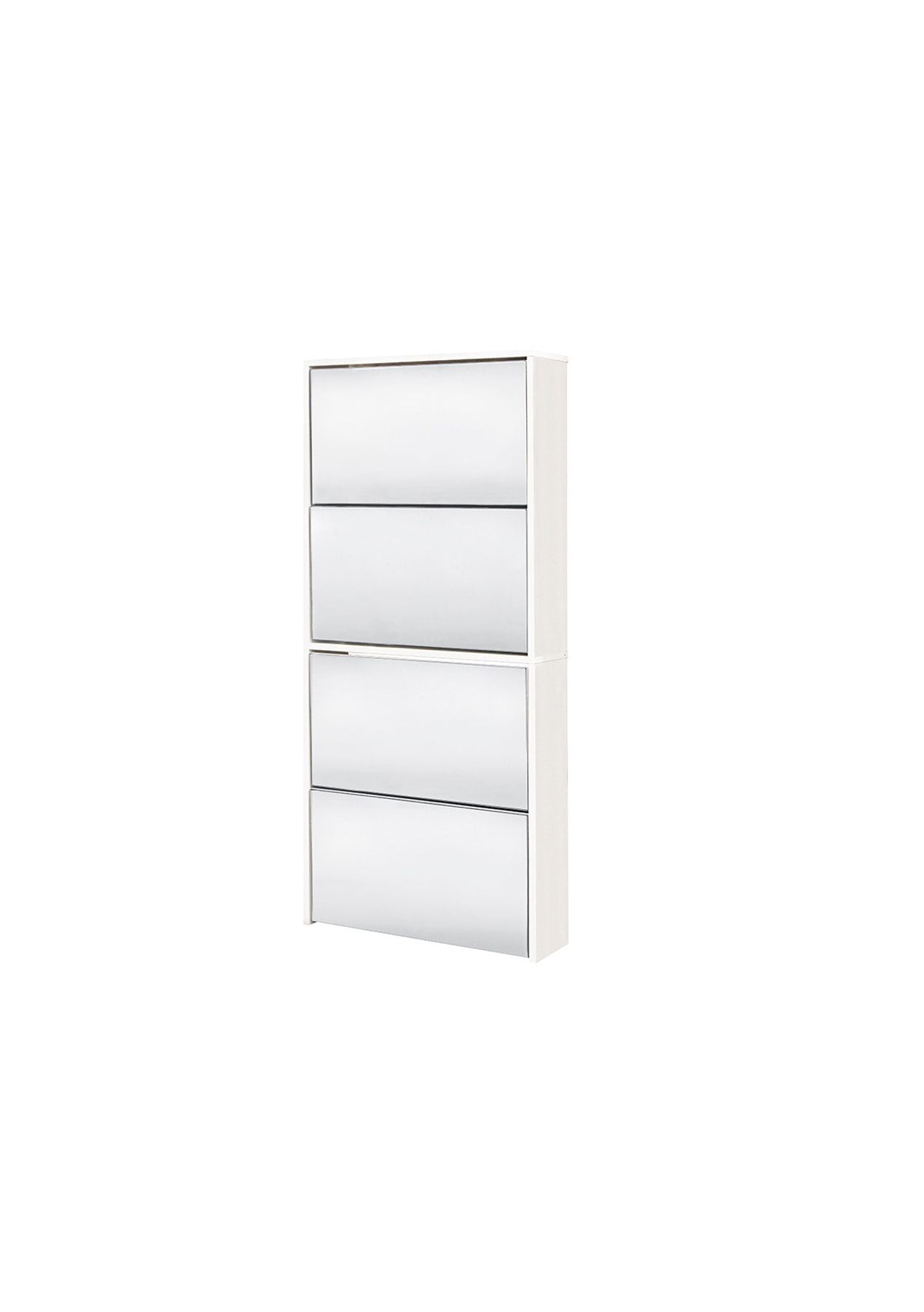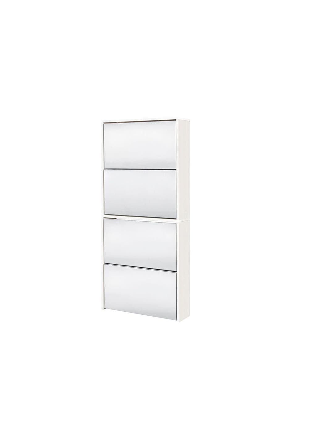 PR7213 (1) - Mirrored Shoe Cabinet 4-Layer WhiteReflection is the unique characteristic of mirrored furniture. It reflects the lights and surroundings to build its own unique pattern. Our gorgeous new arrival mirrored shoe cabinet is a must-have piece for any home. It's modern outward will surely impress your guests and add a bright spot to your entryway. Featuring a slim fit for space-saving and 4 draws with mirror finish doors, it combines functionality and design. Smile at yourself, and check if you've got the perfect look for the day. It is not only keeping your entryway clean and tidy but also helps to start a good mood from the beginning of the day. Oak and white colours are available for your choice.FeaturesMaterial: mirror finish and laminated particleboardColor: WhiteRoll-over Door with mirror veneerProduct dimensions: 60(L)*17(W)*134(H)cmHold min. 8 pairs of shoesAnti-toppling fittingAssembly required Package dimensions: 420mm x 130mm x 1400mmIMPORTANT: * DO NOT climb on the unit. We strongly recommend to use safety straps to fix the unit to a wall. This will help to avoid toppling accidents.