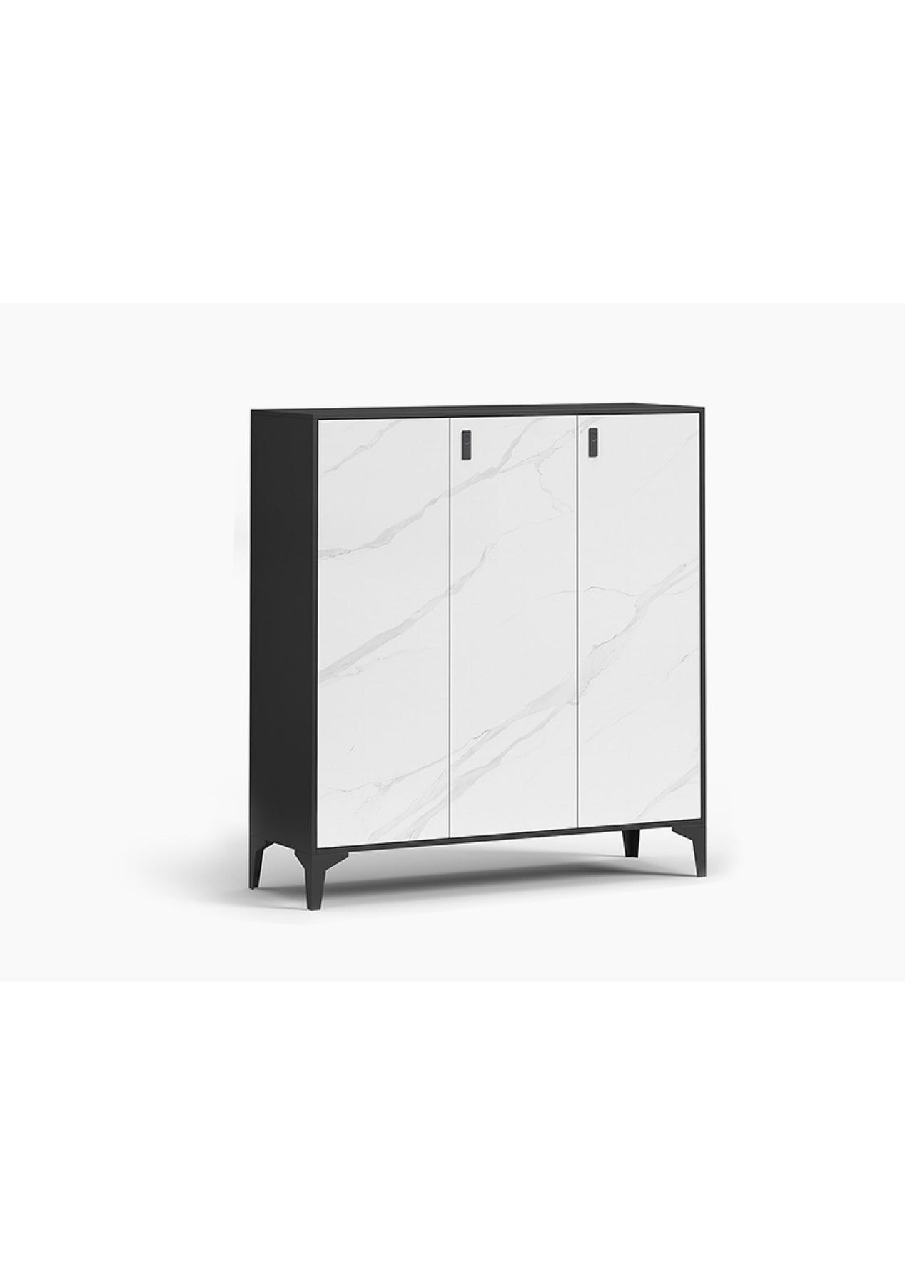 PR65422 Lonna Steel Shoe Cabinet 3-Door White MarbleWith its nature marble looks and immaculate finish, the shoe cabinet will fit in well with any discerning homeowner who desires stylish and yet practical shoe storage. Providing ample storage space, this cabinet has 3 doors of 5 inner shelving to effortlessly house up to 20 pairs of footwear depending on size. Featuring its multifunctional Storage Space, the adjustable panel design of the shoe cabinet is very user-friendly, and it allows you to flexibly adjust it according to different heights and types of shoes. This design ensures that all kinds of footwear such as slippers, formal shoes, high heels, casual shoes, boots, etc. can find the right position to avoid deformation caused by extrusion between shoes. Expertly crafted from high-quality material, this elegant piece of furniture is more than just a storage solution. With its finger print lock, it also can secure your valuable items from lost. Sleek and stylish design, no matter where it is placed, it will be seamless to fit in any décorKindly reminder, don't forget to secure it on wall to prevent tipping injuries. ==Specification==* Product Size: W1000*D340*H1080MM* Material: Steel sheet * Adjustable shelves inside the door. * Legs come with foot adjustable caps allowing it to stand on uneven surfaces.. * Door comes with magnetics to ensure a tight seal.* Finger print lock* Shelfing weight capacity: 30KGS* Color: matte black + Laminated marble pattern package dimensions: 1120mm x 1080mm x 140mm