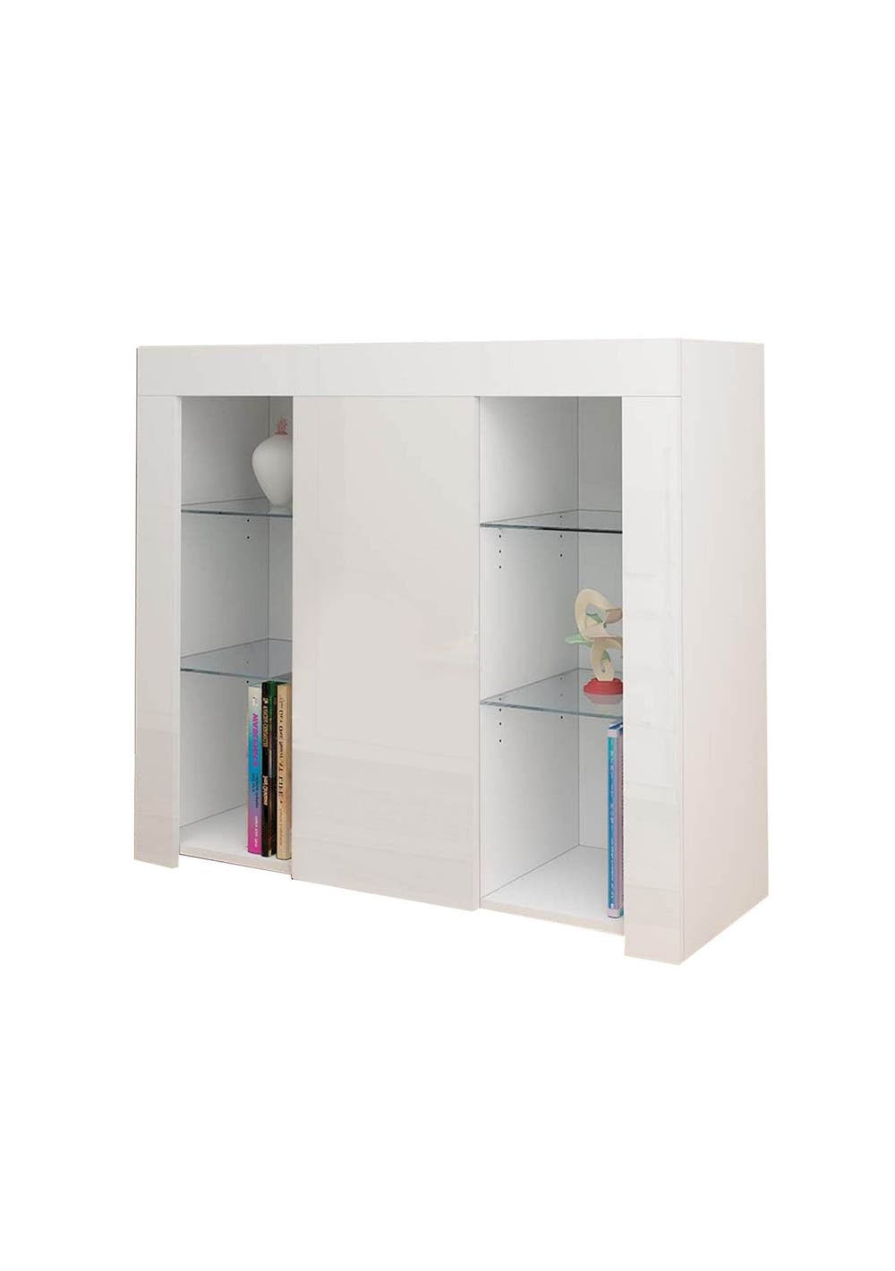 PR10110-Anshos Side Cabinet 94 with LED Light WhiteCrafted from high-quality particle board with melamine, this cabinet is sturdy and durable while maintaining a stylish appearance year after year. The nine compartments offer generous storage space to stash glassware, dishware, and other accessories. The sleek tabletop is perfect for displaying framed photos, delicate statuettes vases, etc. The high-gloss cabinet doors have a handle-less design to maintain the sleek appearance for your entire kitchen, dining room, and other essentials.Equipped with LED lighting, this cabinet not only creates a beautiful ambiance, it brings a bright and inviting atmosphere to your dining room, living room, or any place they live in. It will be the perfect addition to your modern kitchen or dining room with its contemporary and linear design.FeaturesModern designFour tempered glass open shelvesHigh-gloss finish for front doorsLED lightSturdy constructionAmple storage spaceSAA approved adapterStrong cabinet hinges Easy assembly SpecificationsMaterial: ParticleboardFinish: MelamineFront board: UV high glossColor: WhiteOverall dimensions: 94x35x83cm Noted: Due to design problems, only the front parts of the product are gloss. Please pay attention before purchasing.