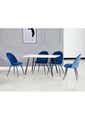 PR8834Lavina Dining Set (120 MDF Top with 4x Blue Chair)If you are after a dining set that is stylishly designed with a modern appearance and one that is versatile, you will love our Lavina dining set. Beautifully crafted with an MDF table top and splayed metal legs, the dining table is strong and sturdy with a presence that blends perfectly with any décor. As for the chair, the vintage-style scallop shell back wraps around and hugs your body to provide perfect support and comfort with its thick padding of high resilience foam and velvet fabric upholstery. Not least, the dining set will blend well with any setting from classic to contemporary and will also soften the flow of rooms with angular furniture and accents. Features: Table x1Chair x4 Table:Reinforced MDF topSmooth edgesHeavy duty fixingsPowder-coated metal legsAnti-slip legs Chair:Sturdy plywood frameSplayed metal legsSoft velvet upholsteryHigh resilience foamReinforced steel fixingsAnti-slip feet padEasy assembly Specifications: TableDimension: 120 x 70 x 75 cmTable top thickness: 18mmWeight capacity: 60kg ChairDimensions: 54.5 x 50 x 83.5 cmWeight capacity: 130kgColour: blue