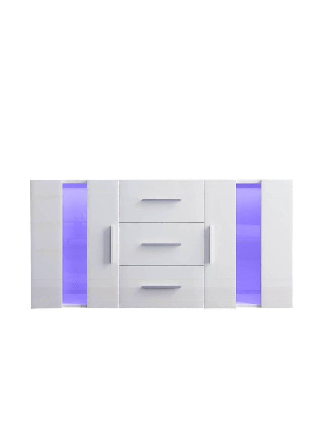 PR10108-Anshos Side Cabinet 135 with LED Light WhiteCrafted from high-quality particle board with melamine, this cabinet is sturdy and durable while maintaining a stylish appearance year after year. The two doors and three drawers concluding seven compartments offer generous storage space to stash glassware, dishware, and other accessories. The sleek tabletop is perfect for displaying framed photos, delicate statuettes vases, etc. The high-gloss cabinet doors with elegant metal handles maintain the classic appearance for your entire kitchen, dining room, and other essentials.Equipped with LED lighting, this cabinet not only creates a beautiful ambiance, it brings a bright and inviting atmosphere to your dining room, living room, or any place they live in. It will be the perfect addition to your modern kitchen or dining room with its contemporary and linear design.FeaturesModern designThree pull-out drawersTwo doors with acrylic platesHigh-gloss finish for front doorsLED lightSturdy constructionAmple storage spaceSAA approved adapterStrong cabinet hinges Easy assembly SpecificationsMaterial: ParticleboardFinish: MelamineFront board: UV high glossColor: WhiteOverall dimensions: 135x32x72cm Noted: Due to design problems, only the front parts of the product are gloss. Please pay attention before purchasing.
