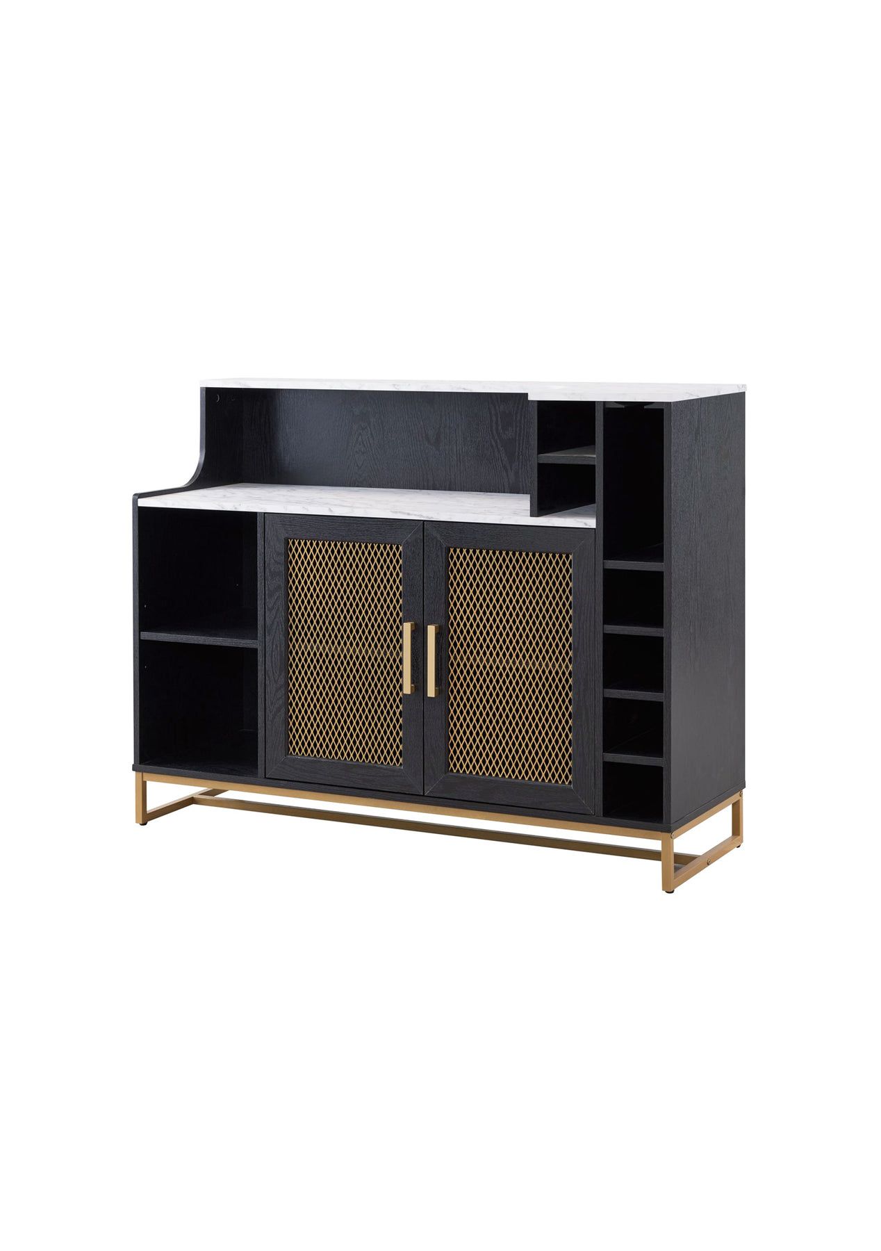 PR71898 Wine Cabinet Dc79 Black This bar cabinet gives you a spot to organize your mixology tools and barware in your living area or dining room. It features open compartments to store wine bottles and a rack to hang glasses. Two side cubbies and a central cabinet with a set of metal mesh double doors provide even more storage space. Crafted from engineered wood, it comes in a two-tone finish that exudes plenty of modern style. There are also multiple surfaces to create your favorite concoctions and display additional bottles and decor.More detailsCabinet Type: CabinetMaterial: MDFColor: BlackAssembled Product Dimensions (L x W x H): 120 x 39.8 x 92.9cmPackage Content1 x Wine Cabinet Dc79 Black1 x Assembly Manual