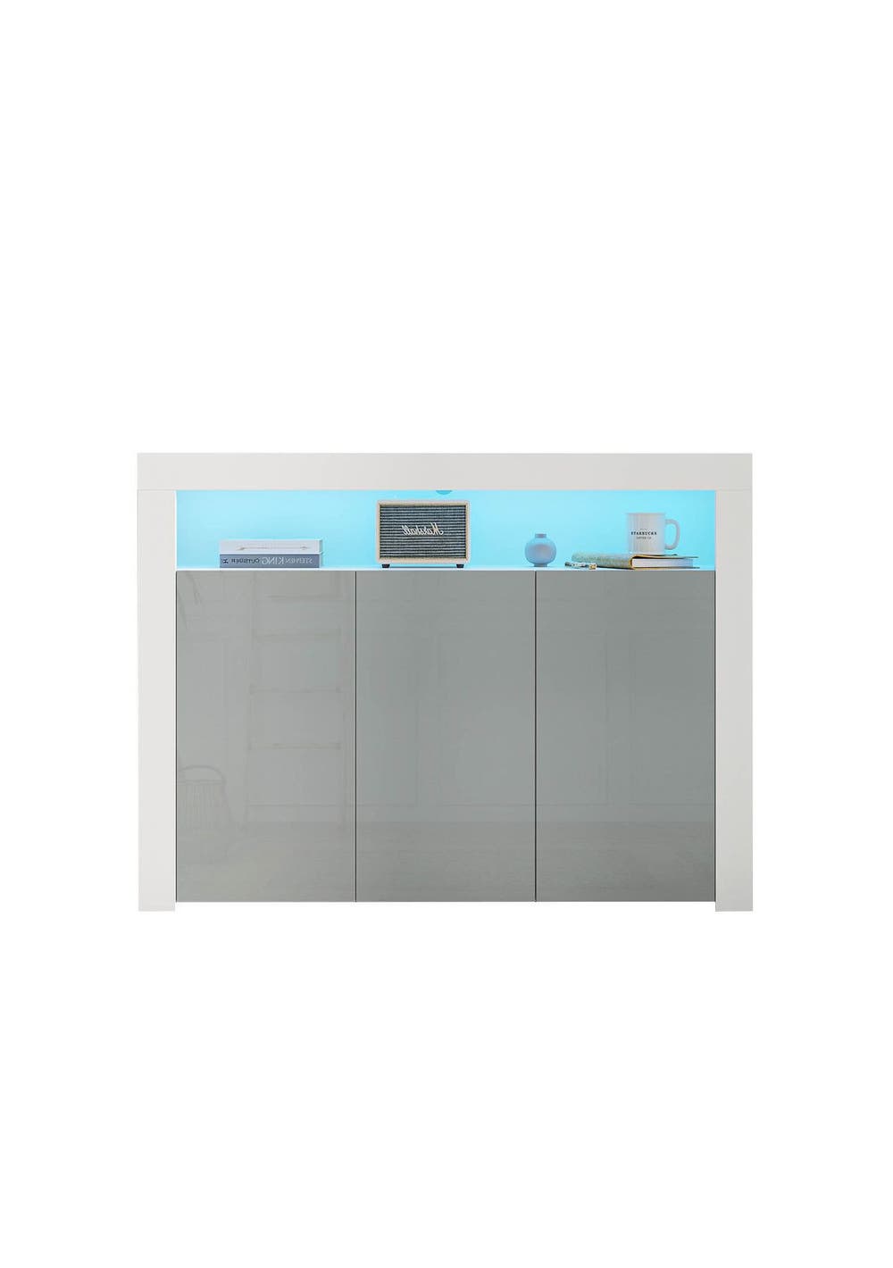 PR10103 T Anshos Buffet 130 with LED Light White+GreyCrafted from high-quality particle board with melamine, this buffet is sturdy and durable while maintaining a stylish appearance year after year. The three doors with six compartments in the cabinet offer generous storage space to stash glassware, dishware, and other accessories. The sleek tabletop is perfect for displaying framed photos, delicate statuettes vases, etc. The high-gloss cabinet doors have a handle-less design to maintain the sleek appearance for your entire kitchen, dining room, and other essentials. The sideboard comes with built-in LED lighting on the open display shelf that can be customized into 16 different colors to suit your preference. Not only does this create a beautiful ambiance, it brings a bright and inviting atmosphere to your dining room, living room, or any place they live in. It will be the perfect addition to your modern kitchen or dining room with its contemporary and linear design.FeaturesHigh-gloss finish for front doorsLED light with customizable colorsModern designSturdy constructionAmple storage spaceSAA approved adapterStrong cabinet hinges Easy assembly SpecificationsMaterial: ParticleboardFinish: MelamineFront board: UV high glossColor: White+GreyOverall dimensions: 130x35x97cm Noted: Due to design problems, only the front parts of the product are gloss. Please pay attention before purchasing.