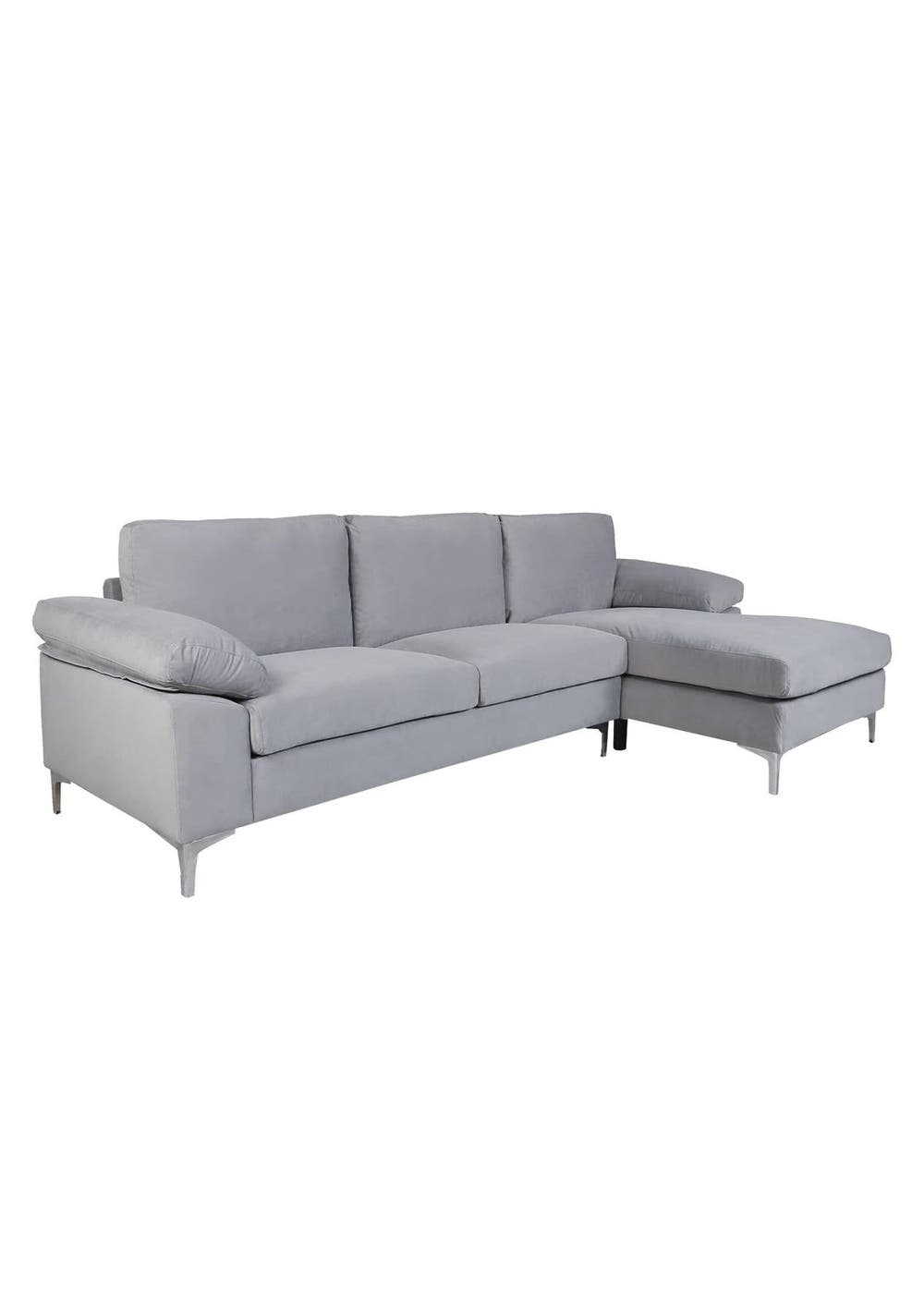 PR72078 - Kaveah Velvet Sectional Sofa with Right Chaise GreyThis Kaveah Corduroy Sectional Sofa is a perfect place to lounge, watch TV, or relax with family and friends. Constructed with a solid wood frame, filled with premium foams, and upholstered in soft velvet fabric, our sofa is sturdy in every way. The seats are comfortable with soft cushions and ample support for your back too. This inviting design envelops you in a cozy embrace, making you feel instantly at ease and comfortable. Suitable for a variety of spaces and styles, this sofa offers you the ultimate experience and helps the body to fully relax. It will give your home the renaissance it deserves.Note: Actual product colors may vary due to lighting, studio photography, room conditions, or different screens on various devices.FeatherContemporary designSturdy wood frameWide armrestSoft velvet fabricSolid metal legsEasy assembleSpecificationColor: greyDimensions: 263x132x77cmWeight capacity: 450kg