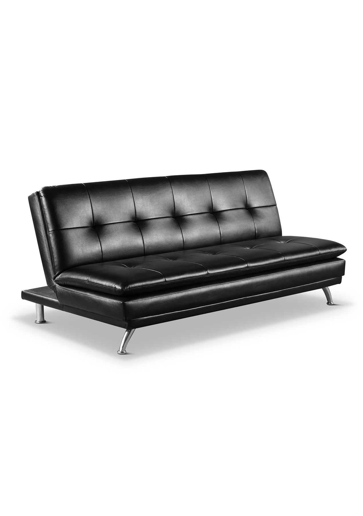 PR11713 - Krom Sofa Bed PU BlackProduct DescriptionSlide this DS Krom Sofa Bed PU Black into your home to enjoy multi-functional comfort. Leather-look fabric is button-tufted to the high-density foam to effortlessly show off the seat and back's plushness. Bring a modern look to your space thanks to the armless design and curved metal legs holding this piece off the ground. Are your guests in need of a snooze? Just use the slider mechanism to turn this futon into an instant bed. Sleek and snuggle-worthy, this DS Krom Sofa Bed PU Black is a dream for you and your visitors.Unique FeaturesLeather-look fabric is finished in a black hue to add chic style to your space.Curved metal legs and no armrests give this futon a modern, sleek look.High-density foam provides a soothing spot for you to relax at the end of your day.Slide the backrest down to flatten this piece so your guests have a cozy place to nap.General DetailsFinish Colour BlackStyle ModernSOFA: L188 x W102 x H83 x SH42 x SD54cmBED: L188 x W113cmPACKAGE CONTENT1 x DS Krom Sofa Bed PU Black1 x Instruction ManualCare InstructionsLeather-Look FabricRemove debris by using a vacuum upholstery crevice tool to get between seat cushions. Wipe clean with a soft cloth dampened with distilled water. Immediately buff upholstery dry using a clean, soft cloth.