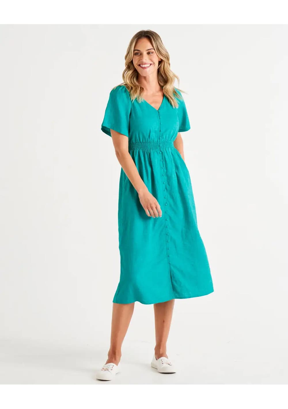 The colour of the Whitney dress from Betty Basics is just stunning! This midi-length dress features a shirred empire waistline, ensuring a flattering fit that embraces comfort without sacrificing style. The relaxed fluted sleeves infuse a touch of elegance, while the V neckline adorned with a self-fabric button bodice adds a charming and distinctive detail. Fabric and Care: Crafted from a blend of 70% Viscose and 30% Linen, this dress offers both style and ease. Maintain its beauty with a cool gentle machine wash, and it's also dry cleanable for your convenience. BETTY BASICS - Whitney Dress in Teal $65.00 Regular Price$20.00Sale Price or 4 interest-free payments of NZ$5.00 with Payment method logo Learn More Size* Select Quantity* 1 Add to Cart Buy Now