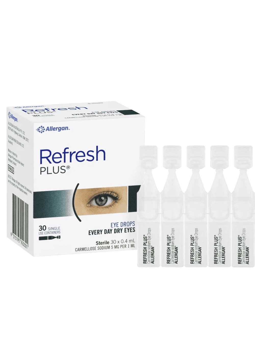 Why choose REFRESH REFRESH PLUSEye Drops - For dry eye sufferers who need to treat dry eyes a few times a day - Convenient single unit doses to fit in pocket or purse - Ideal for on-the-go, in the car, on a plane or in the office - Dry atmosphere in aircraft may cause dry eye - consider packing in your hand luggage What is Dry Eye? Dry Eye is a condition that occurs when your eyes either produce too few tears or the quality of your tears are poor. This can cause dryness, discomfort and may interfere with vision. Symptoms of Dry Eye include: burning or stinging, gritty or foreign body sensation, and watery or blurry. How to use REFRESHEye Drops Step 1 Wash hands with soap and water; dry them with a clean towel. Tilt your head back with both eyes open and look at a point on the ceiling. With your index finger, gently pull your lower eyelid to form a small pocket inside the eyelid. Step 2 With the other hand, gently squeeze 1 drop into the pocket. Do not allow the tip to come into contact with your eye. Step 3 Slowly close both eyes, but do not blink or squeeze your eyes, and gently press the inner corners of your eyes (by your nose) with your fingers for about 2 minutes. This will help the eye drops remain in your eye for a longer period. Step 4 Gently blot extra drops from face with a damp cloth. Repeat steps 1-4 for the other eye. Replace the cap immediately after use. General Information Refresh Plus Eye Drops - for every day dry eyes. REFRESH PLUSrelieves and comforts every day dry eyes. The preservative-free formula avoids the risk of preservative induced irritation. Suitable for frequent and occasional dry eye sufferers. Indication: For the temporary relief of irritation and discomfort associated with dry eyes or exposure to wind or sun. STERILE A. Boxed Contents: 30 single use containers Size: 30 x 0.4 mL Warnings For external use only. If irritation persists or increases, discontinue use and consult your practitioner.To avoid contamination, do not touch tip to any surface.Keep out of reach of children. IMPORTANT INFORMATION Contains no antimicrobial preservative. Use once and discard unused contents. Ingredients Each mL contains: 5mg Carmellose Sodium Directions Make sure container is intact before use. To open: Completely twist off tab, then pull to remove. USAGE ADVICE Instill 1 or 2 drops into eye as frequently as required and discard unused contents. STORAGE INSTRUCTIONS Store below 25°C.