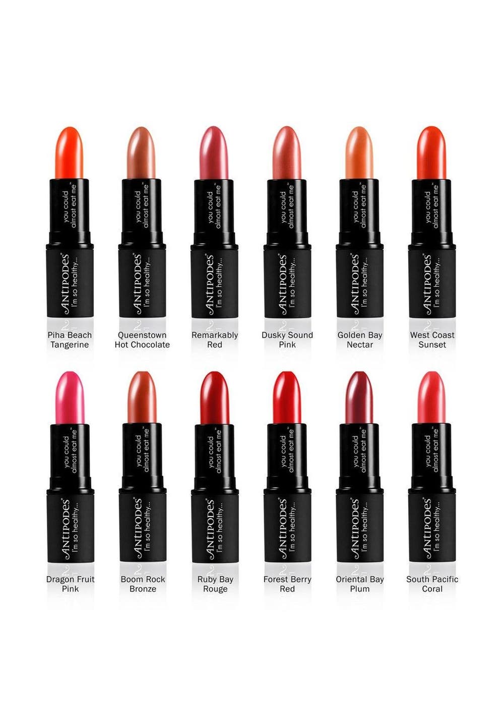Description AntipodesMoisture-Boost Natural Lipstick is formulated with ingredients that are not only safe and natural, but so healthy you could almost eat them! Pure plant oils of avocado, evening primrose, and jojoba seed mean our lipsticks condition as they colour. Premium recyclable packaging: ‚úì FSC-approved cardboard‚úì 100% eco-inks from vegetables Key Ingredients Avocado Oil: nutrient-rich, full of skin-enhancing antioxidants including Vitamins A, B1, B2 and D. Essential fatty acids play a role in boosting collagen. Evening Primrose Oil: rich in essential fats for nourished, healthy skin. Jojoba Oil: renowned for helping to soften skin & reduce the appearance of fine lines, wrinkles, dark spots, & scars. #2 -Golden Bay Nectar Ricinus communis (castor) oil, caprylic/capric triglyceride (coconut derived), Euphorbia cerifera (candelilla) wax, Cera alba (beeswax), Copernicia cerifera (carnauba) wax, Argania spinosa (argan) kernel oil, Butyrospermum parkii (shea) butter, Oenothera biennis (evening primrose) oil, Simmondsia chinensis (jojoba) seed oil, squalane, Persea gratissima (avocado pear) oil, tocopheryl acetate (Vitamin E), Glycine soja (soybean) oil. CONTAINS: Mica, CI 77891 (Titanium Dioxide), CI 77491 (Iron Oxide), CI 19140 (Yellow 5 Lake), CI 15850 (Red 7 Lake). #3 -Queenstown Hot Chocolate Ricinus communis (castor) oil, caprylic/capric triglyceride (coconut derived), Euphorbia cerifera (candelilla) wax, Cera alba (beeswax), Copernicia cerifera (carnauba) wax, Argania spinosa (argan) kernel oil, Butyrospermum parkii (shea) butter, Oenothera biennis (evening primrose) oil, Persea gratissima (avocado pear) oil, Simmondsia chinensis (jojoba) seed oil, squalane, tocopheryl acetate (Vitamin E). CONTAINS: Mica, CI 77891 (Titanium Dioxide), CI 19140 (Yellow 5 Lake), CI 77499 (Iron Oxide), CI 15850 (Red 6 Lake), CI 45410 (Red 27 Lake), CI 15850 (Red 7 Lake). #4 -Boom Rock Bronze Ricinus communis (castor) oil, caprylic/capric triglyceride (coconut derived), Euphorbia cerifera (candelilla) wax, Cera alba (beeswax), Copernicia cerifera (carnauba) wax, Argania spinosa (argan) kernel oil, Butyrospermum parkii (shea) butter, Oenothera biennis (evening primrose) oil, Persea gratissima (avocado pear) oil, Simmondsia chinensis (jojoba) seed oil, squalane, tocopheryl acetate (Vitamin E), Glycine soja (soybean) oil. CONTAINS: Mica, CI 75470 (Carmine), CI 77492 (Iron Oxide), CI 77891 (Titanium Dioxide), CI 77491, CI 77499 (Iron Oxides). #5 - Piha Beach Tangerine Ricinus communis (castor) oil, caprylic/capric triglyceride (coconut derived), Euphorbia cerifera (candelilla) wax, Cera alba (beeswax), Copernicia cerifera (carnauba) wax, Argania spinosa (argan) kernel oil, Butyrospermum parkii (shea) butter, Oenothera biennis (evening primrose) oil, Persea gratissima (avocado pear) oil, Simmondsia chinensis (jojoba) seed oil, squalane, tocopheryl acetate (Vitamin E). CONTAINS: Mica, CI 45410 (Red 27 Lake), CI 15850 (Red 6 Lake), CI 15850 (Red 7 Lake), CI 19140 (Yellow 5 Lake). #6 - West Coast Sunset Ricinus communis (castor) oil, caprylic/capric triglyceride (coconut derived), Euphorbia cerifera (candelilla) wax, Cera alba (beeswax), Copernicia cerifera (carnauba) wax, Argania spinosa (argan) kernel oil, Butyrospermum parkii (shea) butter, Oenothera biennis (evening primrose) oil, Persea gratissima (avocado pear) oil, Simmondsia chinensis (jojoba) seed oil, squalane, tocopheryl acetate (Vitamin E). CONTAINS: Mica, CI 19140 (Yellow 5 Lake), CI 15850 (Red 6 Lake), CI 77891 (Titanium Dioxide), CI 45410 (Red 27 Lake), CI 15850 (Red 7 Lake), CI 77499 (Iron Oxide). #7 - South Pacific Coral Ricinus communis (castor) oil, caprylic/capric triglyceride (coconut derived), Euphorbia cerifera (candelilla) wax, Cera alba (beeswax), Copernicia cerifera (carnauba) wax, Argania spinosa (argan) kernel oil, Butyrospermum parkii (shea) butter, Oenothera biennis (evening primrose) oil, Simmondsia chinensis (jojoba) seed oil, squalane, Persea gratissima (avocado pear) oil, tocopheryl acetate (Vitamin E). CONTAINS: Mica, CI 77891 (Titanium Dioxide), CI 19140 (Yellow 5 Lake), CI 15850 (Red 6 Lake), CI 15850 (Red 7 Lake), CI 77499 (Iron Oxide). #8 - Dusky Sound Pink Ricinus communis (castor) oil, caprylic/capric triglyceride (coconut derived), Euphorbia cerifera (candelilla) wax, Cera alba (beeswax), Copernicia cerifera (carnauba) wax, Argania spinosa (argan) kernel oil, Butyrospermum parkii (shea) butter, Oenothera biennis (evening primrose) oil, Persea gratissima (avocado pear) oil, Simmondsia chinensis (jojoba) seed oil, squalane, tocopheryl acetate (Vitamin E), Glycine soja (soybean) oil. CONTAINS: Mica; CI 77891 (Titanium Dioxide); CI 75470 (Carmine); CI 77491, CI 77492, CI 77499 (Iron Oxides). #9 - Dragon Fruit Pink Ricinus communis (castor) oil, caprylic/capric triglyceride (coconut derived), Euphorbia cerifera (candelilla) wax, Cera alba (beeswax), Copernicia cerifera (carnauba) wax, Argania spinosa (argan) kernel oil, Butyrospermum parkii (shea) butter, Oenothera biennis (evening primrose) oil, Persea gratissima (avocado pear) oil, Simmondsia chinensis (jojoba) seed oil, squalane, tocopheryl acetate (Vitamin E). CONTAINS: Mica, CI 77891 (Titanium Dioxide), CI 45410 (Red 27 Lake), CI 15850 (Red 7 Lake), CI 15850 (Red 6 Lake), CI 77499 (Iron Oxide), CI 19140 (Yellow 5 Lake). #10- Remarkably Red Ricinus communis (castor) oil, caprylic/capric triglyceride (coconut derived), Euphorbia cerifera (candelilla) wax, Cera alba (beeswax), Copernicia cerifera (carnauba) wax, Argania spinosa (argan) kernel oil, Butyrospermum parkii (shea) butter, Oenothera biennis (evening primrose) oil, Persea gratissima (avocado pear) oil, Simmondsia chinensis (jojoba) seed oil, squalane, tocopheryl acetate (Vitamin E), Glycine soja (soybean) oil. CONTAINS: Mica, CI 77891 (Titanium Dioxide), CI 75470 (Carmine), CI 77491, CI 77492, CI 77499 (Iron Oxides). #11 - Ruby Bay Rouge Ricinus communis (castor) oil, caprylic/capric triglyceride (