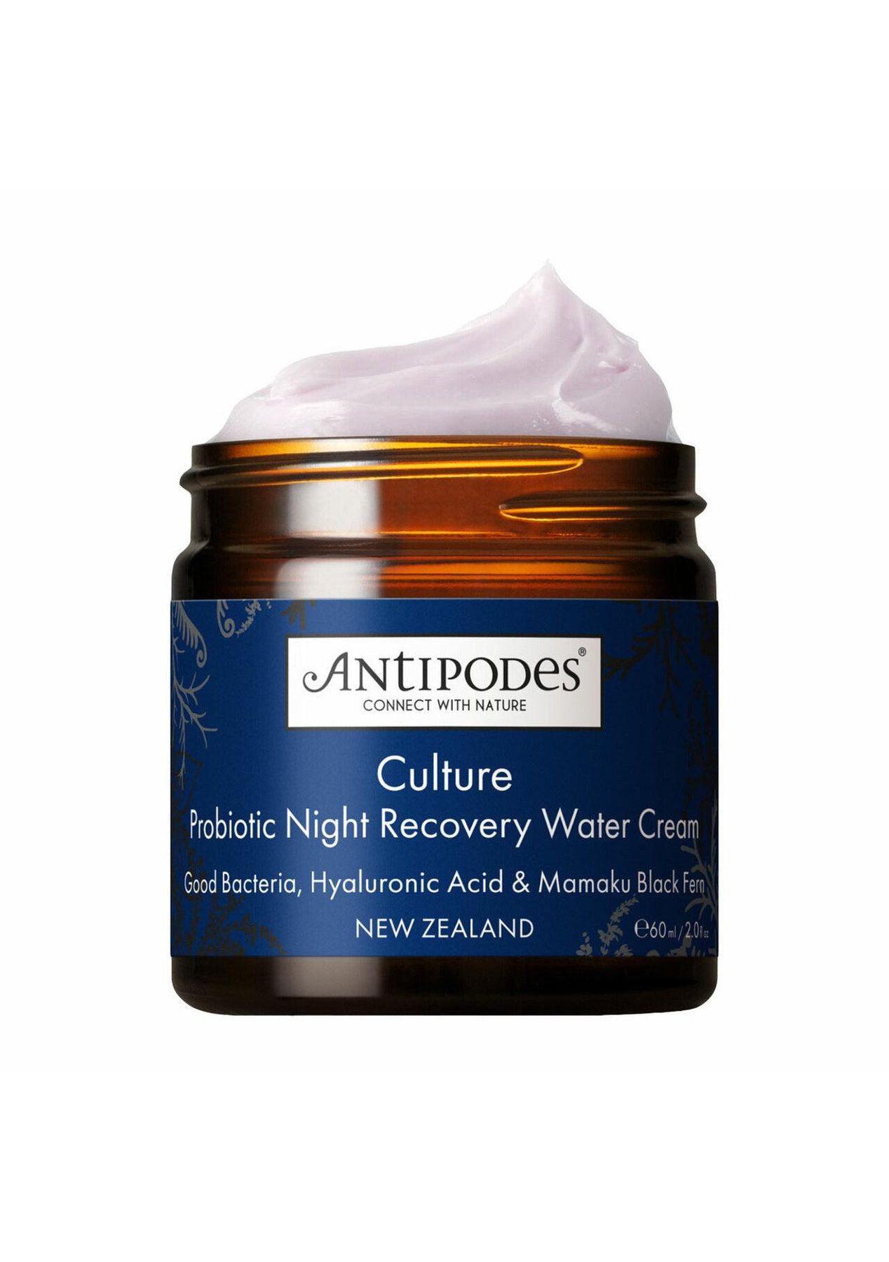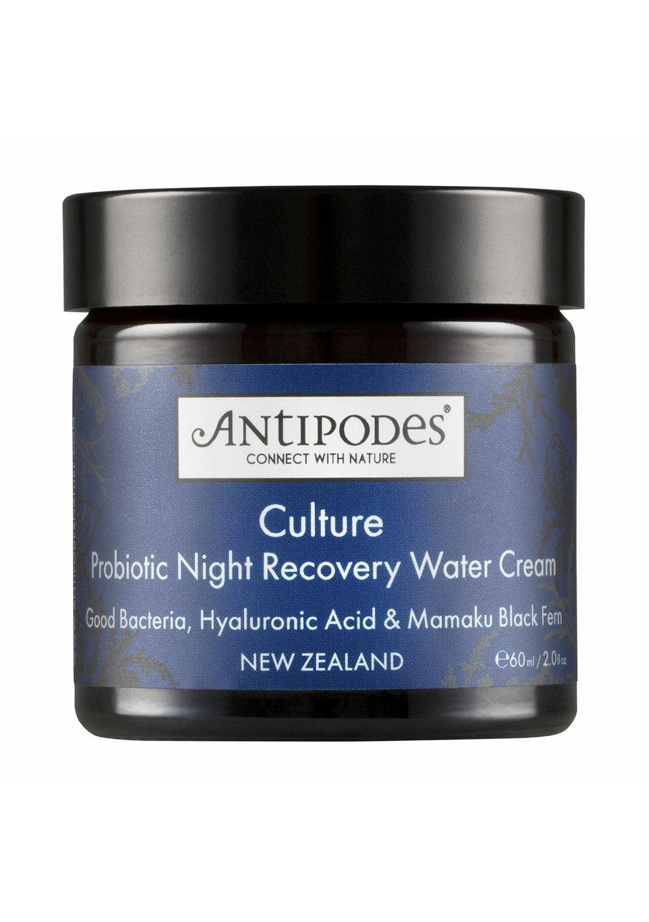 Description Awaken to your calmest, clearest, most hydrated visage with this uniquely textured night moisturiser, formulated with plant-based hyaluronic acid and the power of probiotics. Kalibiome AGE Probiotic is a natural, non-live bacteria which helps to seal the skin‚ epidermal layers, so reducing water loss and protecting against irritants such as pollution. Calm is restored to skin and redness gently reduced. Water levels are boosted thanks to plant-based hyaluronic acid and native New Zealand mamaku black fern. Benefits A cloud-soft vegan water moisturiser for calm, clear, hydrated skin. The premier night cream for skin recovery. Kailibiome AGE Probiotic delivers good bacteria for healthier-looking skin. Suited to all skin types, especially stressed skin Pure plant fragrance of deep, fresh rose Key Ingredients Kalibiome AGE Probiotic: a natural, non-live ‚Äúgood‚Äù bacteria that enhances the skin‚ barrier and helps to balance its delicate microbiome. Plant-based Hyaluronic Acid: specially bio-fermented from vegetables, this powerful attracts and binds water at 1000x its normal weight. Mamaku Black Fern: a New Zealand bioactive extract from Aotearoa‚ iconic native plant. Rich in antioxidants to promote healthy skin, and may increase skin cell turnover. Sustainable clean beauty Certified vegan by the UK Vegetarian Society Recyclable glass jar & FSC-approved cardboard Natural, not tested on animals, and free from toxic ingredients, including petrochemicals, parabens, sulphates, phthalates, and artificial fragrances How To Use Apply AntipodesCulture Probiotic Night Recovery Water Cream each night as part of your deeply calming nightly ritual. Gently smooth a generous layer of this night cream over your face and neck every night after cleansing and toning