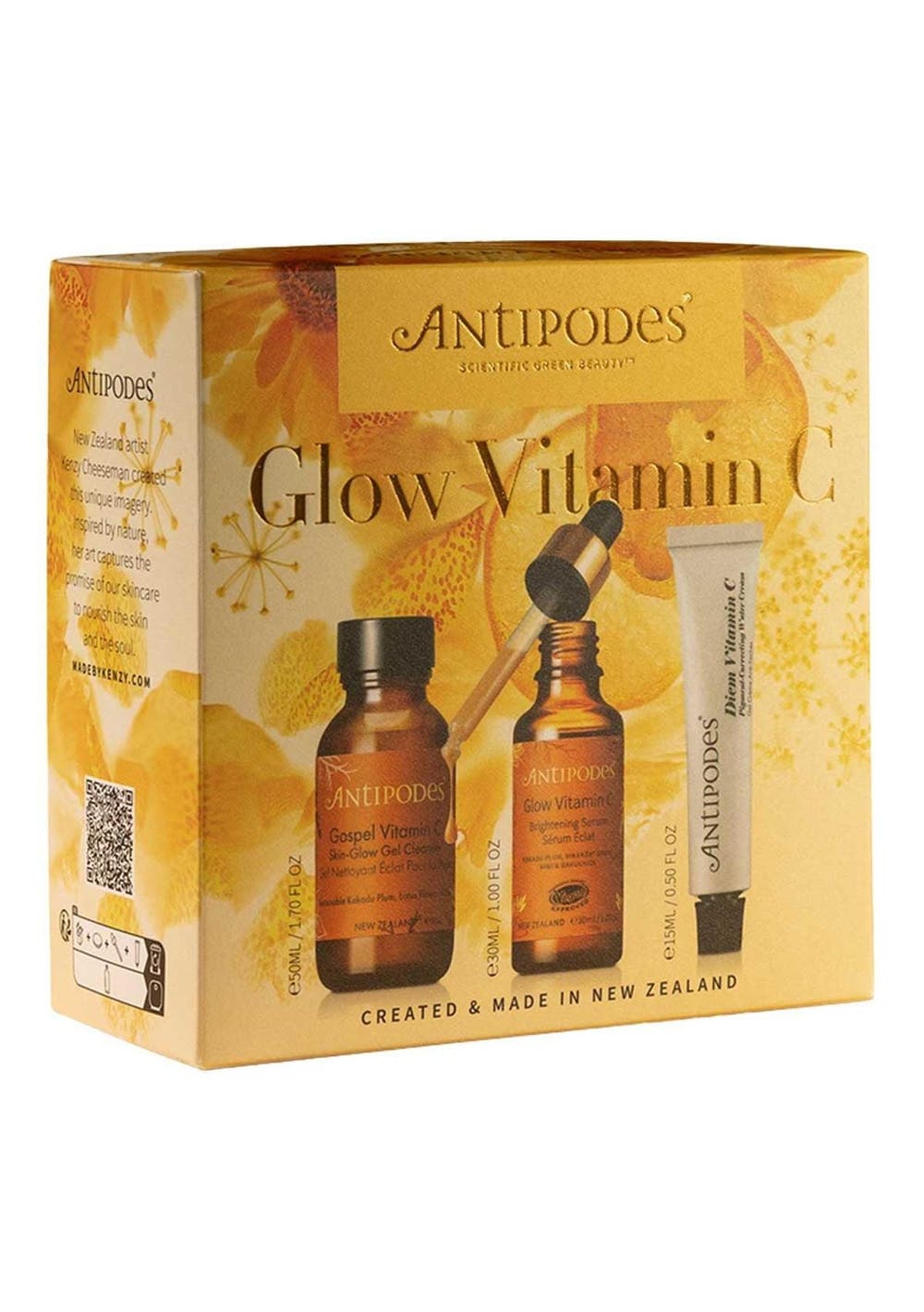 Description Antipodes Glow Vitamin C Skincare Gift Set for brighter skin, featuring three vegan formulations from Antipodes, the ideal Christmas beauty gift.Glow Vitamin C Brightening Serum (30ml):Radiance-boosting gel serum, with natural vitamin C from Kakadu plum to help brighten and protect.Mini Gospel Vitamin C Skin-Glow Gel Cleanser (50ml):Non-drying gel cleanser to refresh the complexion as it lifts lifeless skin.Mini Diem Vitamin C Pigment-Correcting Water Cream (15ml):Brightening moisturiser to target pigmentation and uneven skin tone.