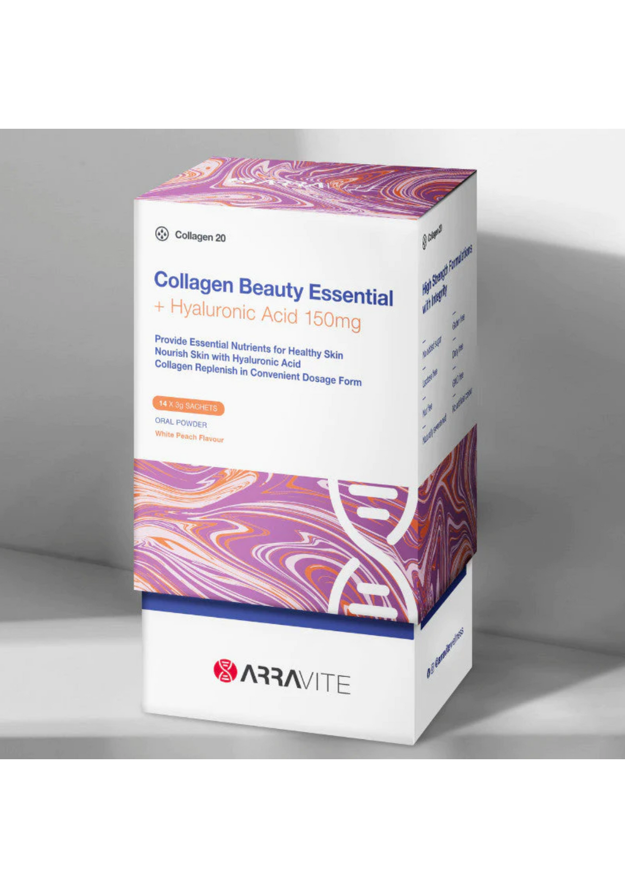 DESCRIPTION Arravite Collagen 20 Collagen Beauty Essential + Hyaluronic Acid 150mg Peach Flavour Natural Marine Collagen Sourced in France Provide Essential Nutrients for Healthy Skin Nourish Skin with Hyaluronic Acid Collagen Replenish in Convenient Dosage Form High Strengh Formulations with Integrity DIRECTIONS 1 to 2 sachets daily, or as directed by a healthcare professional. WARNINGS Contain fish products Always read the label and follow the directions for use. If symptoms persist, talk to your health professional. Vitamin supplements should not replace a balanced diet.