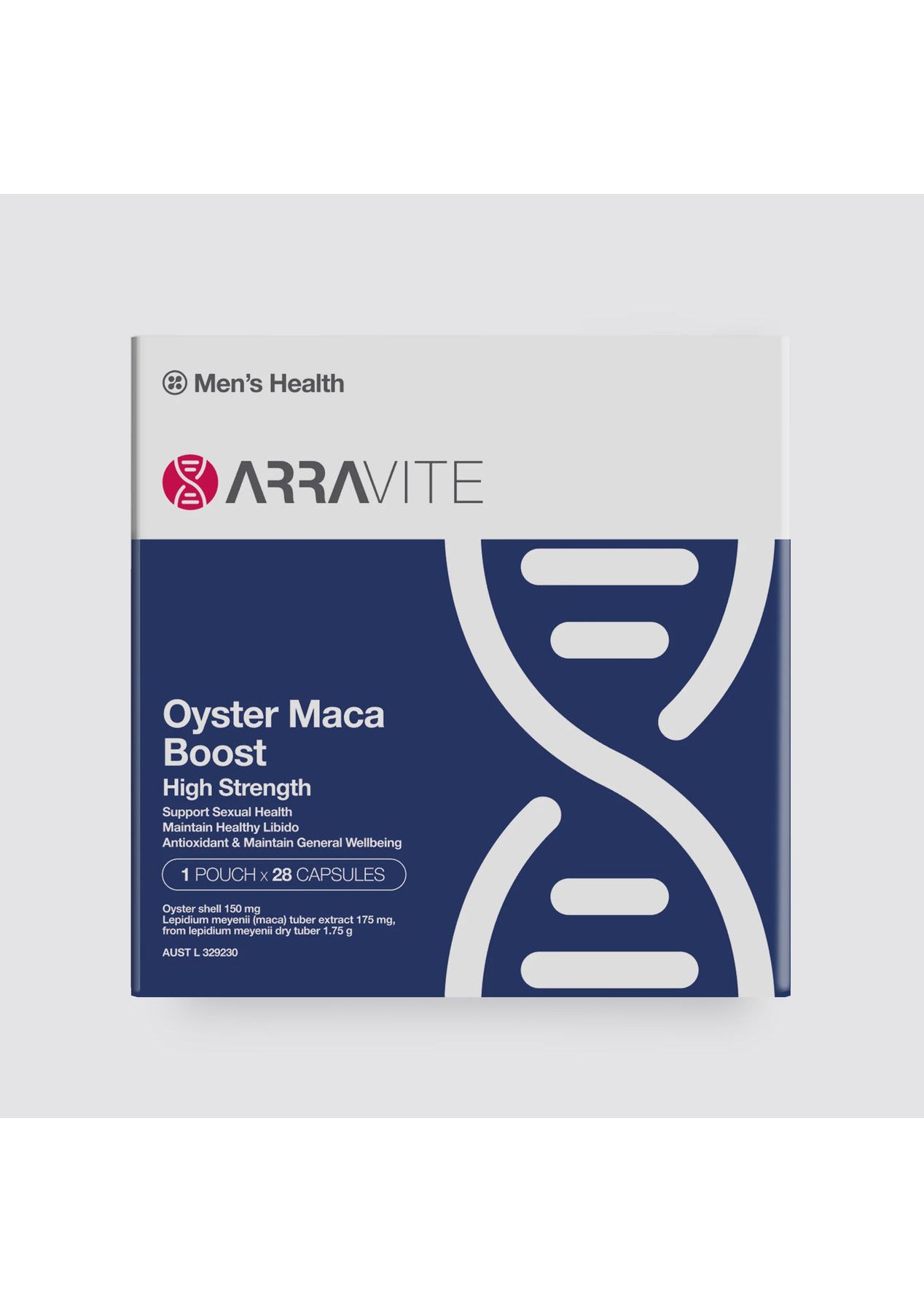 ARRAVITE Oyster Maca Boost High Strength is formulated with high-strength oyster shell and Maca to help:Support Sexual Health and Healthy Libido: Maca helps support sexual health, emotional well-being and healthy libido.Antioxidants and Maintain General Health and Wellbeing: Maca is a rich source of antioxidants to help protect cells against free radical damage and maintain general health and well-being. - Australian made & owned - Based on scientific evidence - A premium quality formula - Manufactured under GMP standards Ingredients Oyster shell 150 mgLepidium meyenii (maca) tuber extract 175 mg, from Lepidium meyenii dry tuber 1.75 gContain shellfish ingredientNo added lactose, gluten, yeast, egg, soy or artificial flavours. Daily dosage Two capsules daily, or as directed by your healthcare professional.Do not use it if the package is broken. Precautions Always read the label. Follow the directions for use. If symptoms persist, talk to your health professional. Supplements may only be of assistance if dietary intake is inadequate.Contains shellfish ingredients.