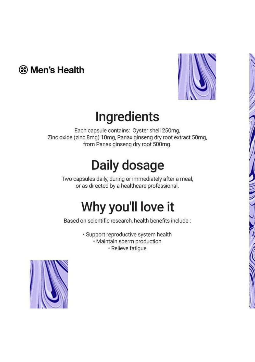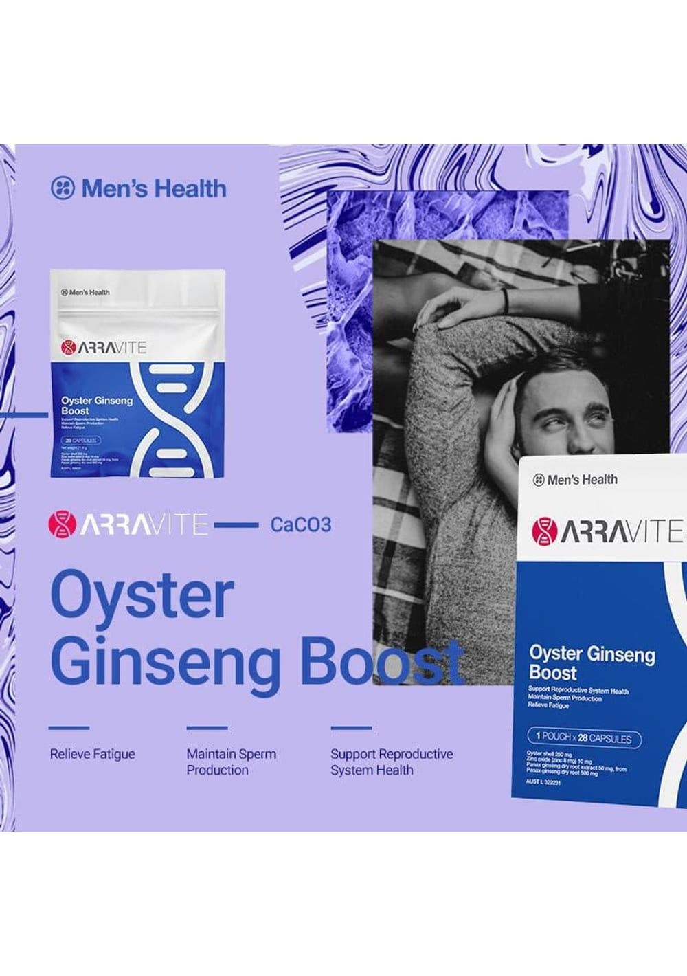 ARRAVITE Oyster Ginseng Boost is a premium formula that contains oyster shell, zinc and Panax ginseng extract. Zinc helps maintain sperm production and supports the male reproductive system health.Panax Ginseng is traditionally used in Western herbal medicine to relieve fatigue. Ingredients Oyster shell 250 mgZinc oxide (zinc 8 mg) 10mgPanax ginseng dry root extract 50 mg, from Panax ginseng dry root 500 mgContains shellfish ingredients.No added lactose, gluten, yeast, egg, soy or artificial flavours. Daily dosage Two capsules daily, or as directed by your healthcare professional.Do not use if the package is broken. Precautions Always read the label. Follow the directions for use. If symptoms persist, talk to your health professional. Supplements may only be of assistance if dietary intake is inadequate.Contains shellfish ingredients.