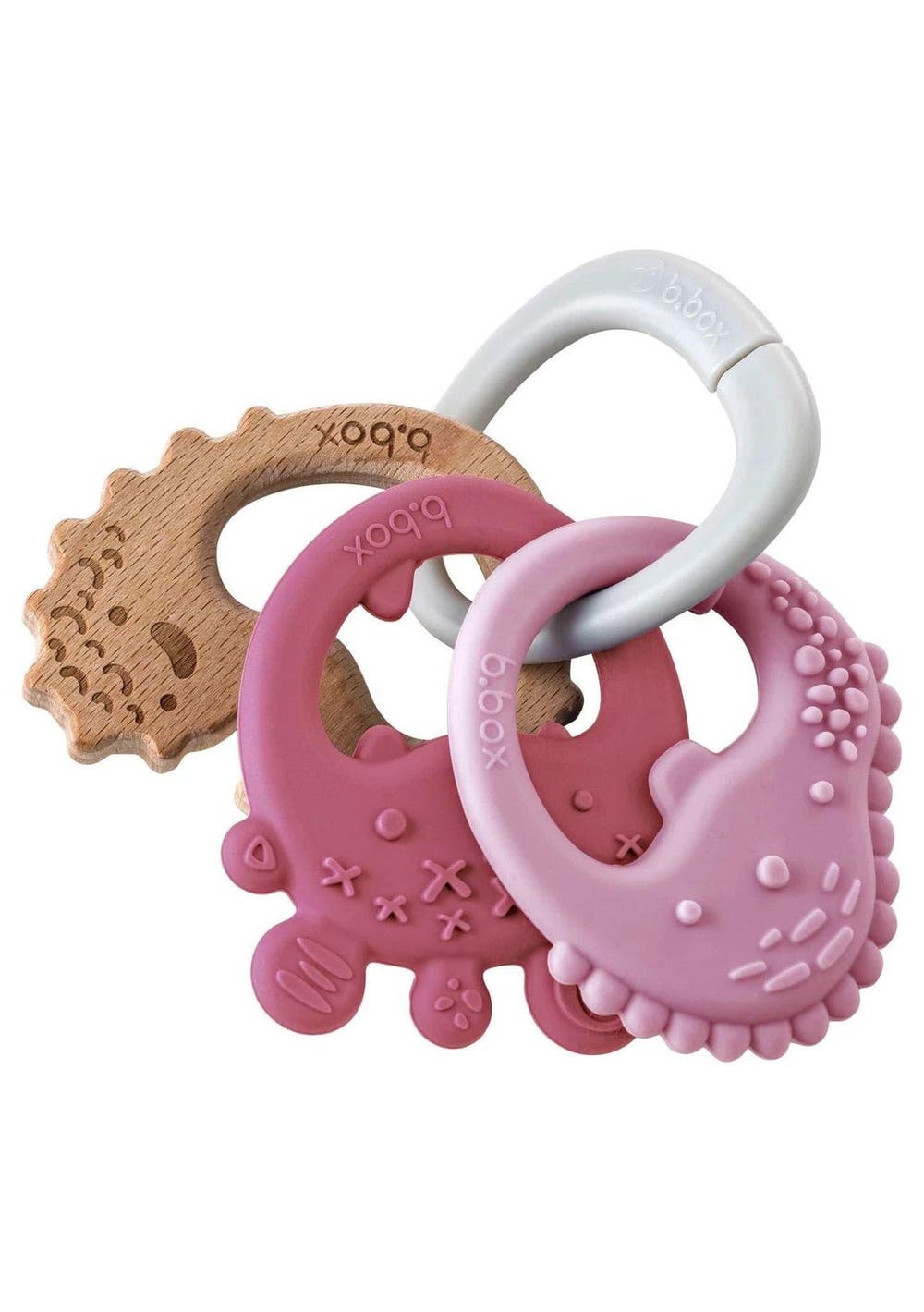Description Introducing the B.Box trio teether. It‚ three textured teethers on one handy ring offering the choice of silicone and beechwood throughout the teething journey. Lightweight and easy to hold, use individually or as a set with customisable ring attachment to provide relief to sore, achy gums and stimulate sensory development. Suitable from 3 months and designed to grow with baby. Soft silicone ideal for early stages of teething, medium silicone features coarser textures and longer features to relieve the middle mouth and beechwood offers firm pressure with protruding features to comfortably reach the back of bubs mouth. Teethers are made from non-toxic, food grade silicone (steriliser and dishwasher safe - top rack only) and antibacterial beechwood (hand wash only). Features Three teethers on one handy ring with varied textures gently massage sore and achy gums Made from quality, non-toxic materials; food-grade silicone and antibacterial beechwood Suitable for varied stages of the teething journey Provides relief for front, middle and back gums Lightweight and easy to grasp Multi-sensory design Silicone is dishwasher (top rack only) and steriliser safe Beechwood requires handwash only