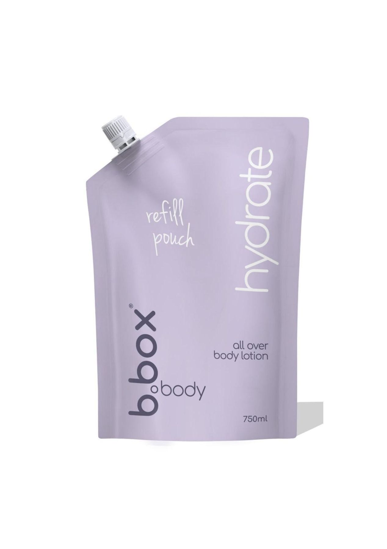 Description B.Box Hydrate body lotion helps soften and calm delicate baby skin Active botanicals of Kakadu plum, aloe vera and shea butter boost hydration and replenish dry and sensitive skin Natural calendula and Roman Chamomile provide antioxidants to help soothe irritation while smelling delicious Developed by a baby skincare expert + mum No synthetics, parabens or dyes Choose to reuse with our refill packs, sold separately Ingredients Aloe Barbadensis (Aloe Vera) Leaf Juice; Caprylic/Capric Triglyceride (coconut derived); Glycerin; Simmondsia Chinensis (Jojoba) Seed Oil; Cetearyl Alcohol; Cetvl Alcohol; Myristyl Myristate; Butyrospermum Parkii (shea) Butter; Aqua; Polysorbate 60; Xanthan Gum; Benzyl Alcohol; Sodium Benzoate; Citrus aurantium dulcis (Orange) Peel Oil; Potassium Sorbate; Lavandula Angustifolia (Lavender) Oil; Pelargonium Graveolens (Geranium) Oil; Lactic Acid; Dehydroacetic Acid; Cananga Odorata Flower (Ylang ylang) Oil; Anthemis Nobilis Flower (Roman chamomile) Oil; Terminalia Ferdinandiana Fruit (Kakadu plum) Extract; Camellia Sinensis Leaf (Green Tee) Extract; Calendula Officinalis (Calendula) Flower Extract; Citronellol; Limonene; Linalool; Geraniol How To Use Apply a generous amount onto bub's skin after bath time or throughout the day Massage into skin until absorbed Can be used on face and body Store product below 30⁰C. For external use only. Patch test before use. Discontinue if irritation occurs. Avoid contact with eyes. Rinse eyes immediately should the product come into contact with them. Keep out of reach of children, except under adult supervision