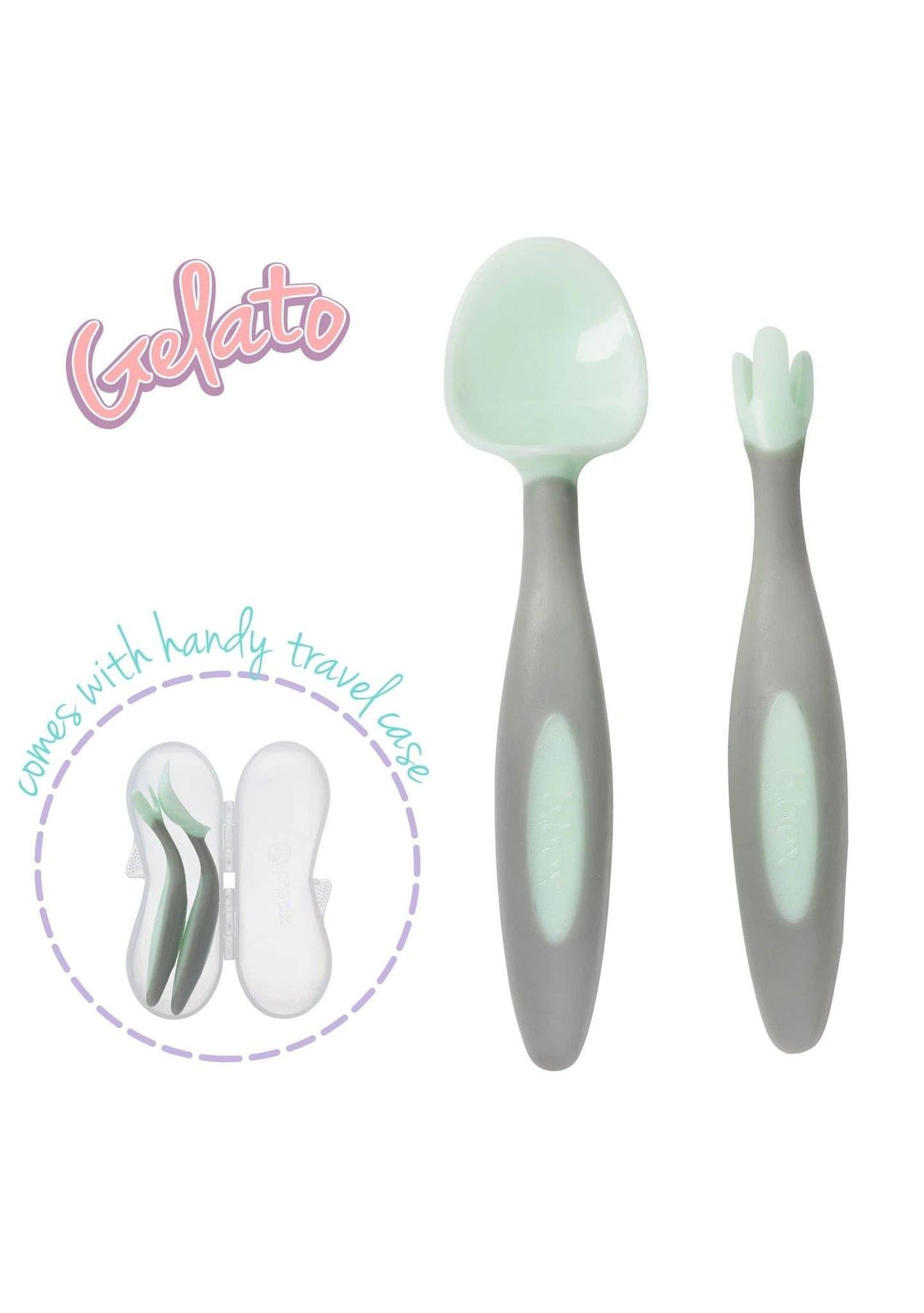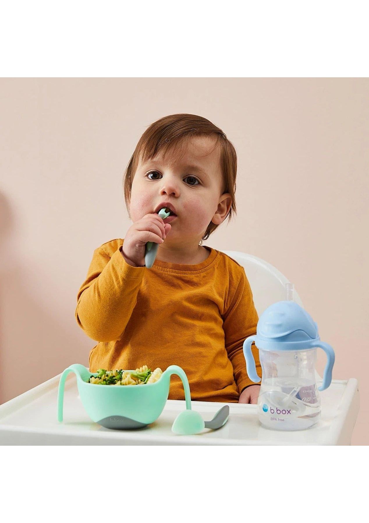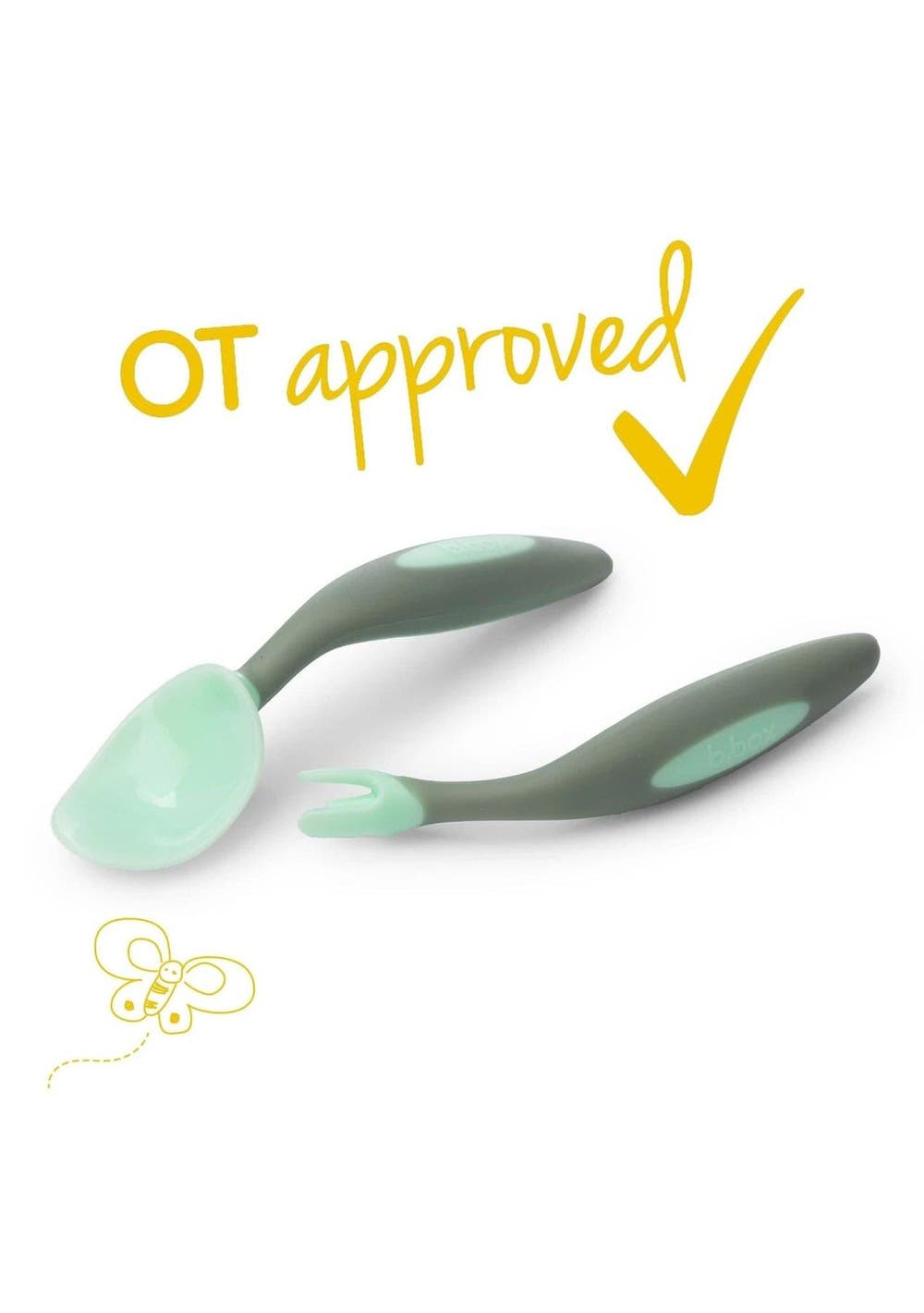Description Our cutlery set has been designed with a leading paediatric occupational therapist (OT) as the ideal toolkit for tots who are ready to self feed. The unique spoon shape acts as shovel helping little ones to scoop up their food, even with a flat plate. The unique deep scoop spoon shape and angled handles encourages correct hand to mouth positioning, and helps to contain food within the spoon as bubs practices bringing it to his/her mouth, which means more food makes it to the mouth and less mess! Our unique flork has been designed to fit the size and shapes of little mouths. Its curved blunt prongs are gentler (and safer) on little mouths and gums. Set comes complete with a handy travel case to keep utensils clean before mealtime on the go, and after to prevent soiling in nappy bags or hand bag. Features 9m+ Designed in consultation with leading paediatric occupational therapist Easy grip handles angled for optimum hand to mouth positioning Large spoon head doubles as a shovel to enable kids to scoop up food. Unique fork designed to fit the size and shape of little mouths. Design assists kids to safely pierce + lift food. Handy travel case keeps things clean Dishwasher-safe Made from PP and TPE Dimensions: flork: 11cm length, spoon: 13cm length, case closed: 14x5.5x3.5cm BPA, Phthalates and PVC free