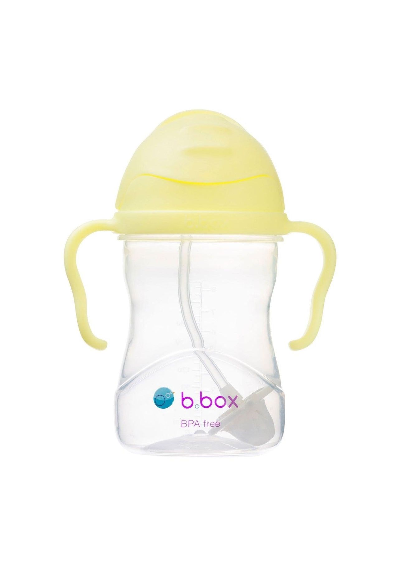 Description Our award-winning sippy cup features our innovative B.Box weighted straw that moves with the liquid – whatever angle the cup is tilted. Our redesigned straw has a unique two-way valve, ensuring easy drinking and NO leaks, even with warm water. The sippy cup ensures that tots can drink to the very last drop. They can also drink lying down, making it the ideal transition cup from bottle/breast feeding to milk in a cup. The perfect cup at home or on the go. Encourages independence with easy-grip handles and simple flip-top lid. Available in your favourite colours, with a premium matte-finish. Features 6m+ Weighted straw moves with the liquid, whatever angle the cup is held Simple flip top lid Base also fits training cup lid and spout cup lid Dishwasher safe Sippy cup base is microwave safe. Do not microwave sippy cup lid and straw Made from PP and silicone, steel weighted ball Dimensions (cup with lid) 15 x 12 x 7.5cm 240mls/8oz capacity BPA, Phthalates and PVC free