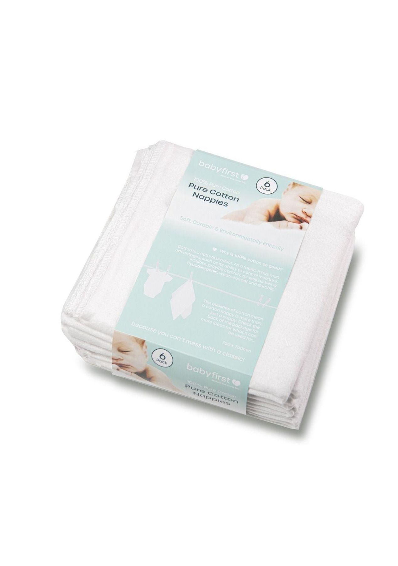 Description Baby First Pure Cotton Nappies are soft and gentle on your baby's skin. This 6-pack of high-quality nappies is made from pure cotton for maximum comfort and absorbency. Perfect for your little one's delicate needs. Features Size: 760 x 760mm Colour: White 100% cotton Warm machine wash, line dry in shade Do not bleach, tumble dry, iron or dry clean