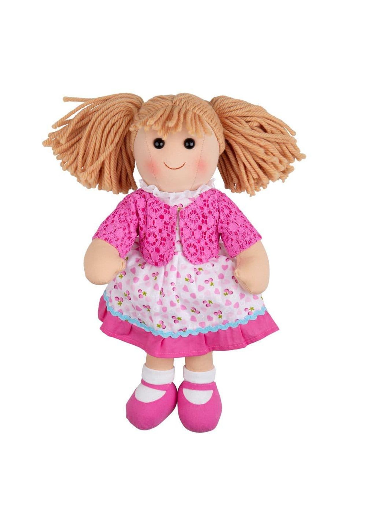 Description Meet Becky - this soft and cuddly ragdoll cant wait to be loved and adored by her new best friend! Her adorable outfit includes a pink dress patterned with love hearts and a smart jacket. Her super sweet smile is sure to capture your little ones heart at first sight! Meet your little one's new best friend, Becky, a 35cm soft & cuddly rag doll. Becky is dressed up smart ready for a special occasion! Specifications Age: Birth +Dimensions: 9 x 35 x 19cm