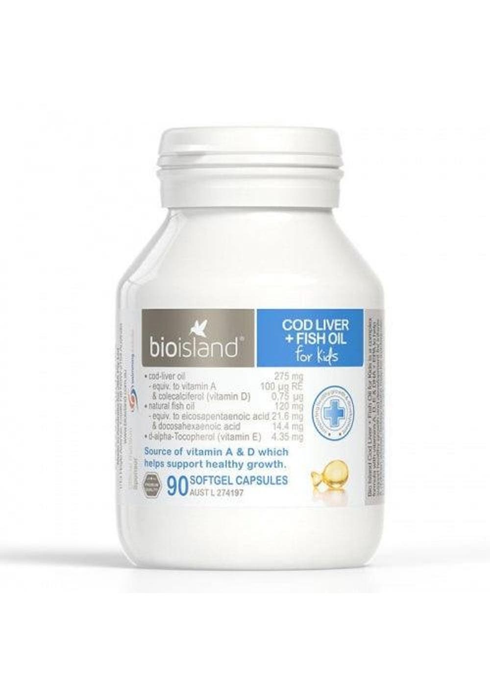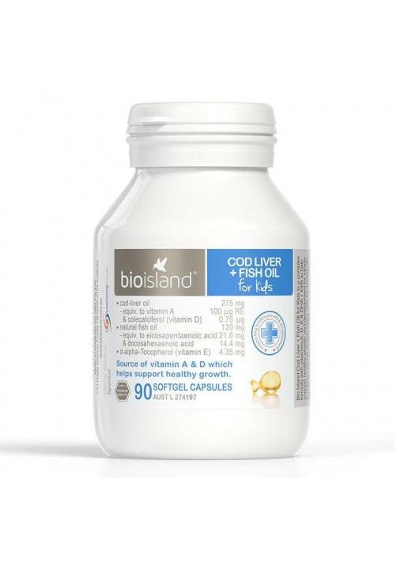 THIS PRODUCT MAY NOT BE RIGHT FOR YOU. ALWAYS READ THE LABEL, WARNINGS AND INSTRUCTIONS FOR USE, BEFORE PURCHASE. VITAMIN AND MINERAL SUPPLEMENTS SHOULD NOT REPLACE A BALANCED DIET. General Information Source of vitamin A & D which helps support healthy growth. Warnings Vitamin supplements can only be of assistance if dietary intake is inadequate. Always read the label. This medicine may not be right for you. Read the warnings before purchase. Contains fish products. STORE: below 30°C in a dry place away from direct sunlight. The appearance of this product may vary slightly due to using natural fish oil. Common Uses A combination of cod liver oil which is a natural source of vitamin A & D and fish oil which is rich in omega 3 fatty acids to help support healthy growth and development for infants and children whose dietary inatke may be inadequate. Ingredients Each capsule contains:Cod Liver Oil 275mgEquiv. to Vitamin A 100mcg RE (333IU)& Colecalciferol (Vitamin D 30IU) 0.75mcgFish Oil – Natural 120mgEquiv. to omega-3 marine triglycerides 36mgAs eicosapentaenoic acid (EPA) 21.6mg& Docosahexaenoic acid (DHA) 14.4mgD-Alpha Tocopherol (Vitamin E 6.5IU) 4.35mg Directions Infants 0-6 months: exclusive breastfeeding is recommended, consult your healthcare professional and use only as directed. 7-12 months take 1-2 capsules daily; 1-3 yrs take 2 capsules daily; 4-8 yrs take 3 capsules daily; 9+ yrs take 4 capsules daily, or as directed by your healthcare professional. Please take with meal.For children under 4 yrs, cut the capsule tail and squeeze the contents onto a spoon before administering into mouth. Alternatively, the dosage can be squeezed onto food.