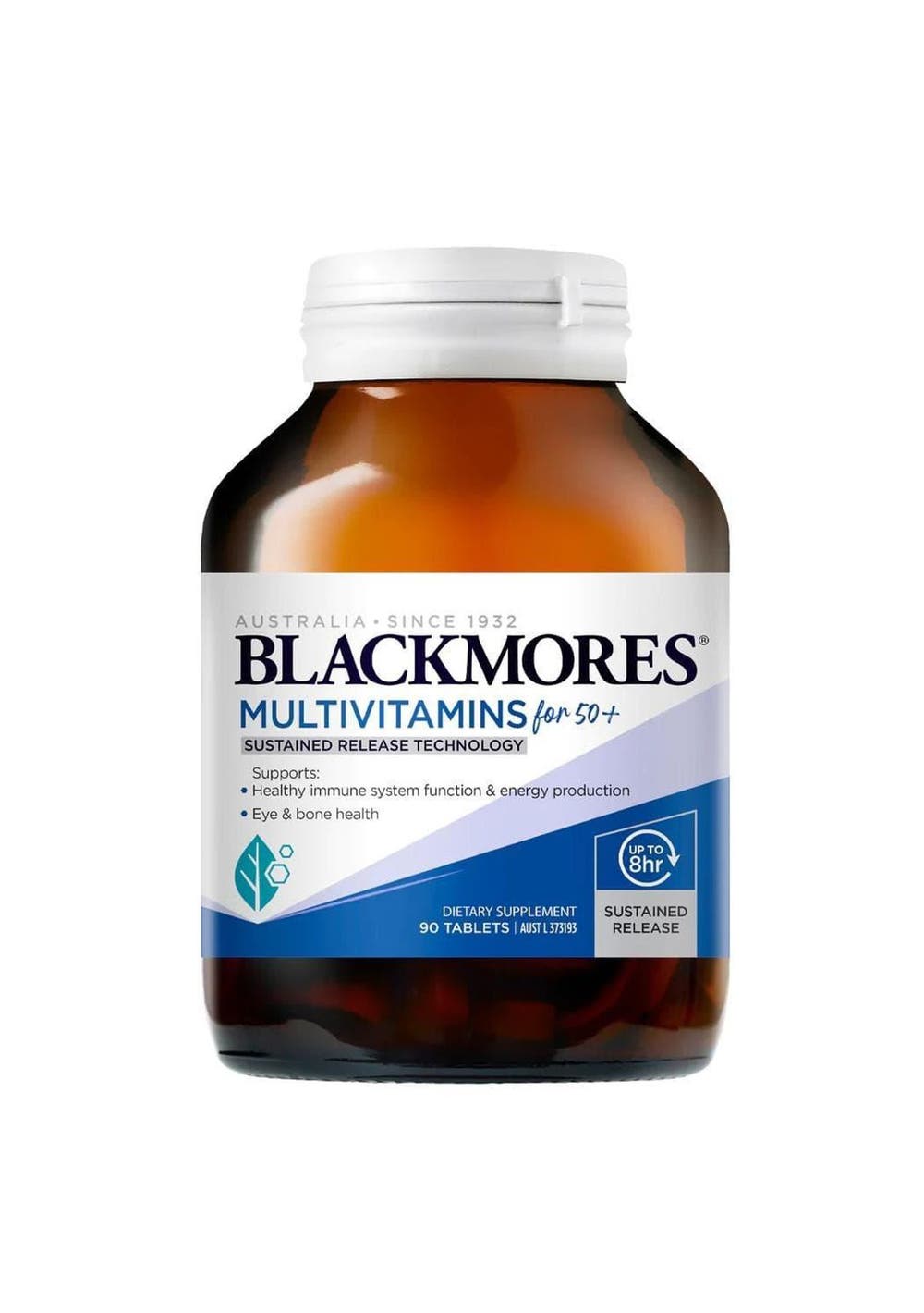 Description BlackmoresMultivitamins for 50+ with Sustained Release Technology is a tailormade blend of essential vitamins & minerals for people aged 50+. It is formulated to support immune system function and energy production. This convenient one-a-day multivitamin supports eye and bone health and is designed with a unique sustained release technology that release nutrients to the body gradually throughout the day. BlackmoresMultivitamins for 50+ with Sustained Release Technology provides a steady release of nutrients to give you lasting energy for up to 8-hours a day. At Blackmores our multivitamins are formulated to deliver doses of key nutrients to address your specific needs and support your general health & wellbeing. Ingredients Ferrous fumarate (iron 5 mg) 15.7 mg, d-alpha-tocopheryl acid succinate (vitamin E 14.9 IU) 12.3 mg, Ascorbic acid (vitamin C) 45 mg, Thiamine nitrate (thiamine 1.2 mg) 1.5 mg, Riboflavin (vitamin B2) 1.6 mg, Nicotinamide 16 mg, Pyridoxine hydrochloride (pyridoxine vitamin B6 1.7 mg) 2.1 mg, Calcium carbonate (calcium 325 mg) 812.5 mg, Calcium pantothenate (pantothenic acid, vitamin B5 6 mg) 6.5 mg, Heavy magnesium oxide (magnesium 105 mg) 183.8 mg, Cupric sulfate phtahydrate (copper 600 micrograms) 2.4 mg, Zinc oxide (zinc 10 mg) 12.4 mg, Manganese sulfate monohydrate (manganese 3.5 mg) 10.8 mg, Biotin (vitamin H) 30 micrograms, Selenomethionine (selenium 50 micrograms) 125 micrograms, Folic acid (vitamin B9) 200 micrograms, Phytomenadione (vitamin K1) 35 micrograms, Potassium iodide (iodine 150 micrograms) 197 micrograms, Chromic picolinate (chromium 35 micrograms) 282 micrograms, Colloidal anhydrous silica 20 mg, Colecalciferol (vitamin D3 600 IU) 15 micrograms, Cyanocobalamin (vitamin B12) 2.4 micrograms, Retinol acetate (vitamin A, 750 micrograms retinol equivalents) 884.3 micrograms Suggested Use Adults - Take 1 tablet once a day, or as professionally prescribed. Take with food. Additional Product Information Warning: Always read the label. Follow the directions for use. If symptoms persist, talk to your health professional. If you are pregnant or considering becoming pregnant do not take vitamin A supplements without consulting your doctor or pharmacist. When taken in excess of 3000 micrograms retinol equivalents - vitamin A can cause birth defects. The recommended daily amount of vitamin A from all sources is 700 micrograms retinol equivalents for women and 900 micrograms retinol equivalents for men. This product contains selenium which is toxic in high doses. A daily dose of 150 micrograms for adults of selenium from dietary supplements should not be exceeded. Supplements may only be of assistance if dietary intake is inadequate.Contains soya bean products and sulfites.