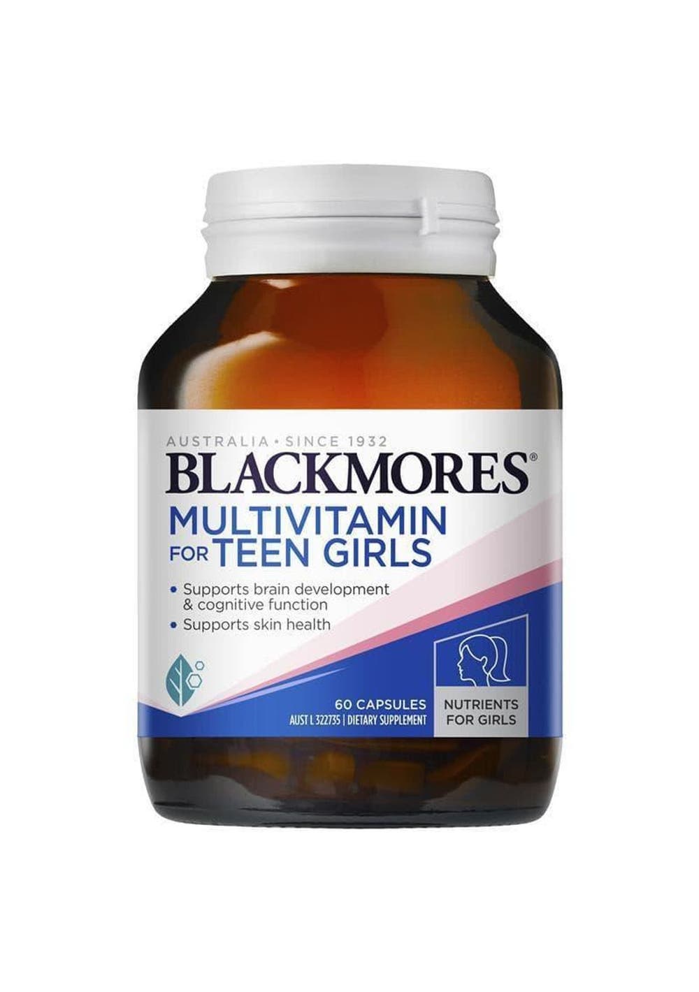Description Teenage years are critical years for the development of body and teenagers can often have poor eating habits, which may make them vulnerable to nutritional shortfalls.Blackmores Multivitamin for Teen Girls is formulated with essential nutrients to support healthy growth and development for teenage Girls. Ingredients Active Ingredients: Fish oil (natural) 286 mgcontaining omega-3 marine triglycerides 85.8 mg as:Eicosapentaenoic acid (EPA) 51.5 mgDocosahexaenoic acid (DHA) 34.3 mgPotassium iodide 197 microgram (iodine 150 microgram)Ferrous fumarate 5.7 mg (iron 5 mg)Zinc sulfate monohydrate 41.6 mg (zinc 15 mg)Cyanocobalamin (vitamin B12) 2 microgramDunaliella salina extract soft conc. 75 mg equiv. to fresh cell 75 mg(stand. to carotenoids 3 mg calculated as betacarotene)Thiamine nitrate 1.36 mg (thiamine, vitamin B1 1.1 mg)Riboflavin (vitamin B2) 1.1 mgNicotinamide (vitamin B3) 14 mgCalcium pantothenate 4.36 mg (pantothenic acid, vitamin B5 4 mg)Pyridoxine hydrochloride 1.5 mg (pyridoxine, vitamin B6 1.23 mg)Folic acid 200 microgramAscorbic acid (vitamin C) 40 mgColecalciferol (vitamin D3 200IU) 5 microgramd-alpha-tocopherol 8.72 mg (vitamin E 13 IU)Biotin 25 microgramCalcium carbonate 17.5 mg (calcium 7 mg)Chromium picolinate 193 microgram (chromium 24 microgram)Heavy magnesium oxide 59.8 mg (magnesium 36 mg)High selenium yeast 50 mg (selenium 50 microgram)Colloidal anhydrous silica 23.5 mg (silicon 11 mg) Suggested Use Children 12 years and over - Take 1 capsule daily with a meal, or as professionally prescribedChildren under 12 years – Only as professionally prescribed. Additional Product Information Warning: Always read the label Use only as directed Supplements may only be of assistance if dietary intake is inadequate This product contains selenium, which is toxic in high doses. A daily dose of 150 micrograms for adults of selenium from dietary supplements should not be exceeded Contains sulphites, fish and soya bean products If you have any pre-existing conditions, or are on any medications always talk to your health professional before use Some products should be ceased at least two weeks before any elective surgery, please confirm with your health professional