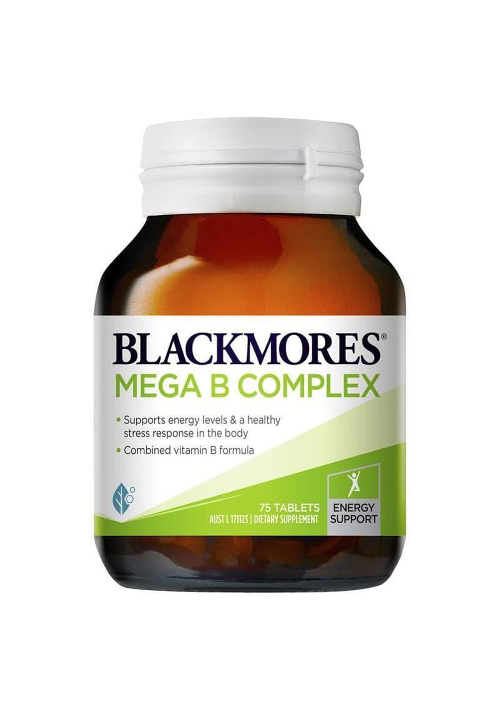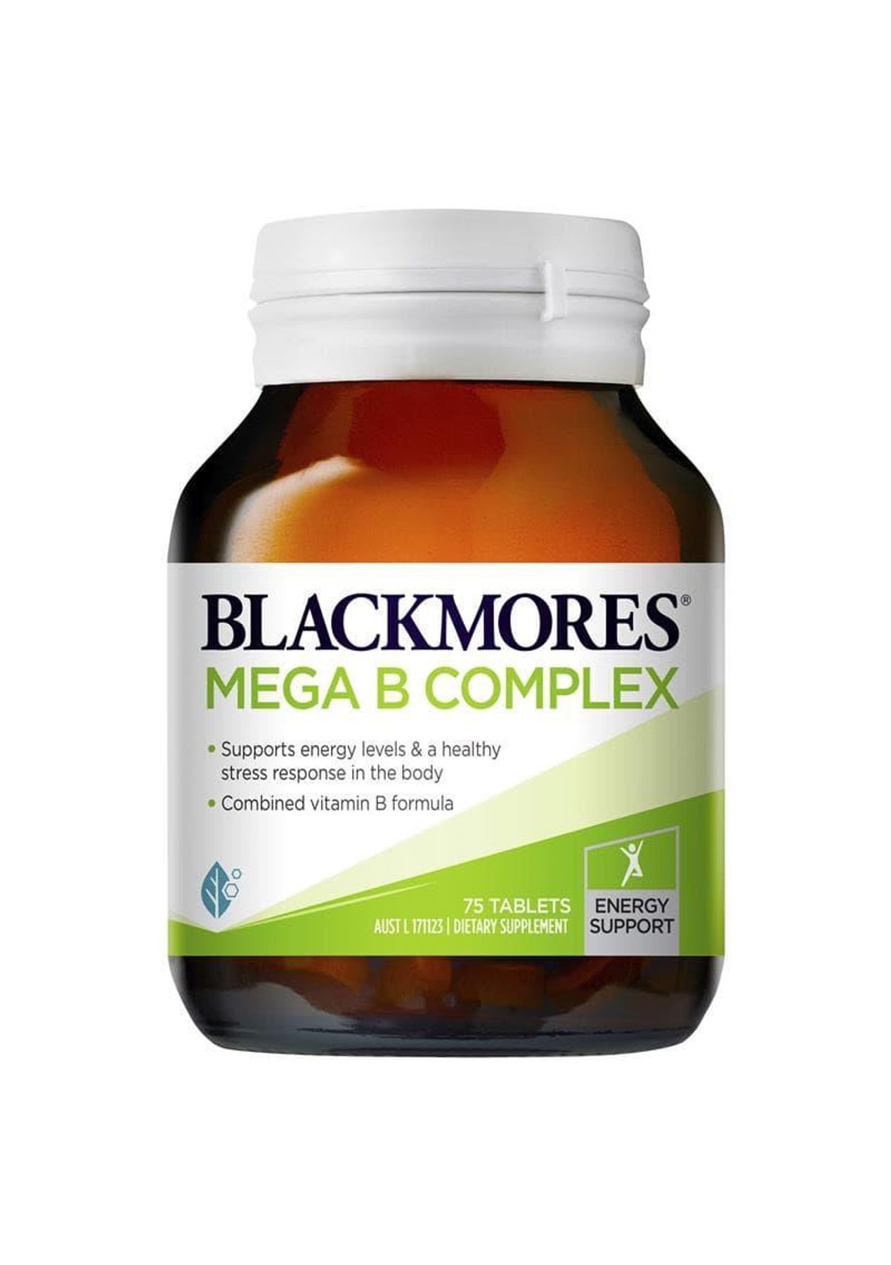 Description Blackmores Mega B Complex is a high potency formula provides nutrients that may be depleted by strenuous physical activity. B vitamins support the production of energy from food & help maintain healthy nervous system function. Ingredients Thiamine hydrochloride (vitamin B1) 50 mg Riboflavin (vitamin b2) 30 mg Nicotinamide 100 mg Calcium pantothenate (pantothenic acid, vitamin B5 45.8 mg) 50 mg Pyridoxine hydrochloride (vitamin B6) 50 mg Cyanocobalamin (vitamin B12) 50 µg Biotin (vitamin H) 50 µg Choline bitartate 50 mg Inositol 50 mg Folic acid 300 µg Suggested Use Adults – Take 1 tablet a day with a meal, or as professionally prescribed. Children under 18 years – Only as professionally prescribed. Additional Product Information Warning: Not recommended for use during pregnancy or breastfeeding Vitamin B2 (riboflavin) supplements may change urine colour to bright yellow. This is harmless and temporary Vitamin supplements should not replace a balanced diet Always read the label Use only as directed If you have any pre-existing conditions, or are on any medications always talk to your health professional before use Some products should be ceased at least two weeks before any elective surgery, please confirm with your health professional
