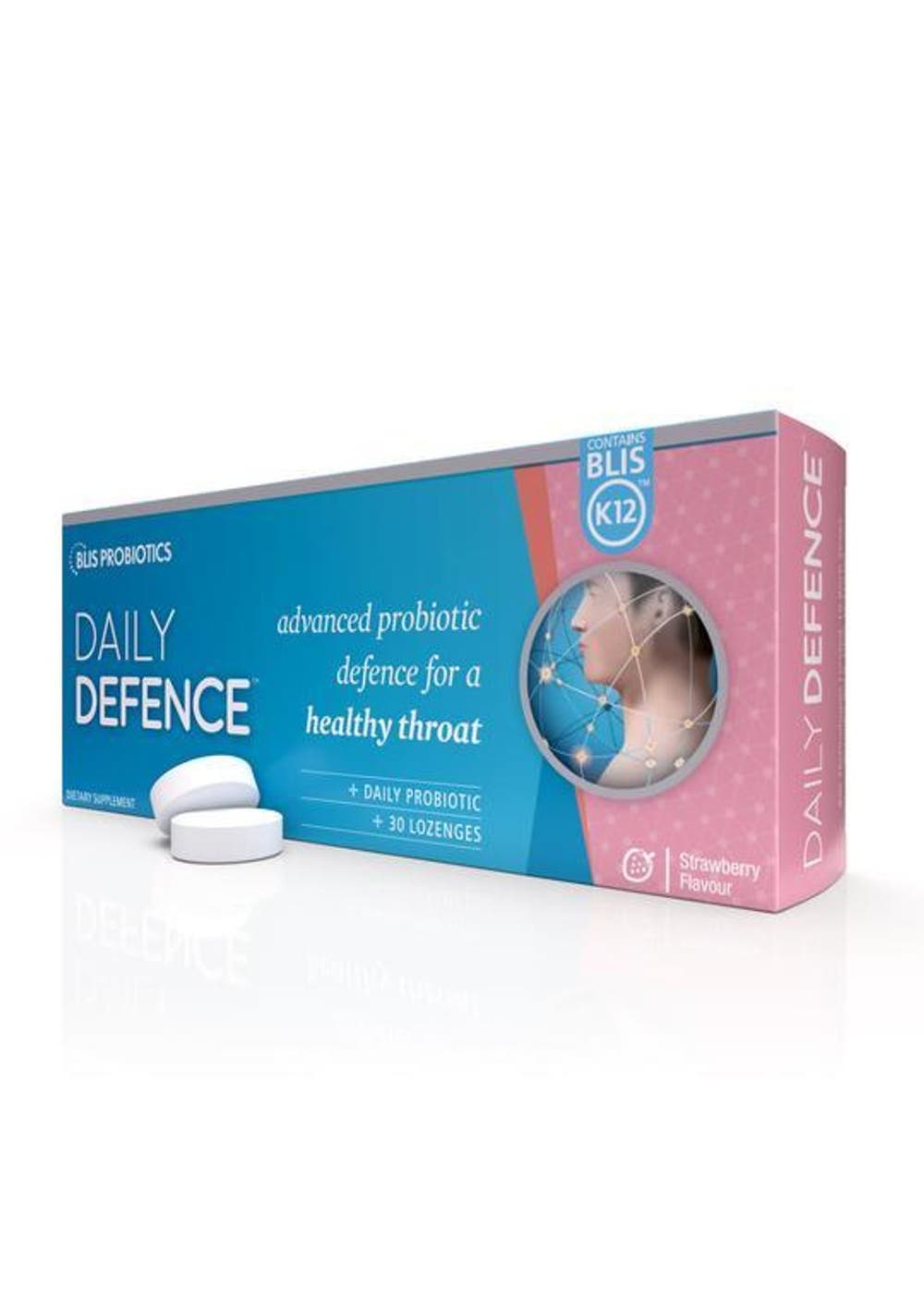 Guarding the gateway to good health Immunity support for your body starts at the mouth and throat. Your mouth and throat (oral cavity) is home to billions of bacteria. Every day, the things you eat, drink and breathe introduce new bad bacteria that attempt to displace the natural and beneficial bacteria of your oral cavity. This can cause a change or imbalance of the beneficial bacteria in the mouth and throat, which can affect your overall health and wellbeing. DailyDefence with BLIS K12™ is a scientifically developed oral probiotic that helps support and protect your natural immune system at the gateway to your body – the mouth and throat. BLIS K12™ is a new generation of advanced oral probiotics, developed from a special strain of beneficial bacteria called Streptococcus salivarius that is found to occur naturally in the healthy mouths & throats of adults and children. Directions For best results, slowly dissolve one lozenge on the tongue, 1-2 times a day, ideally after brushing teeth. In times of high need, take a maximum of 4 lozenges per day. DailyDefence works best if eating or drinking can be avoided for at least 30 minutes after taking. The longer BLIS K12™ is in your mouth, the better the colonisation will be and more bad bacteria can be crowded out. Recommended for ages 3 and over. DailyDefence can be taken during pregnancy and while breastfeeding. Do not take DailyDefence while taking antibiotics. If you have an immune compromised condition, please seek your doctor's advice before taking this product. Ingredients (per dose) Isomalt, Tableting Aids, Natural Flavour, Streptococcus salivarius K12 (contains at least 1.25 billion cfu/dose at the date of manufacture), Natural Flavour. Made on equipment that also processes milk and soy. Store below 25°C.