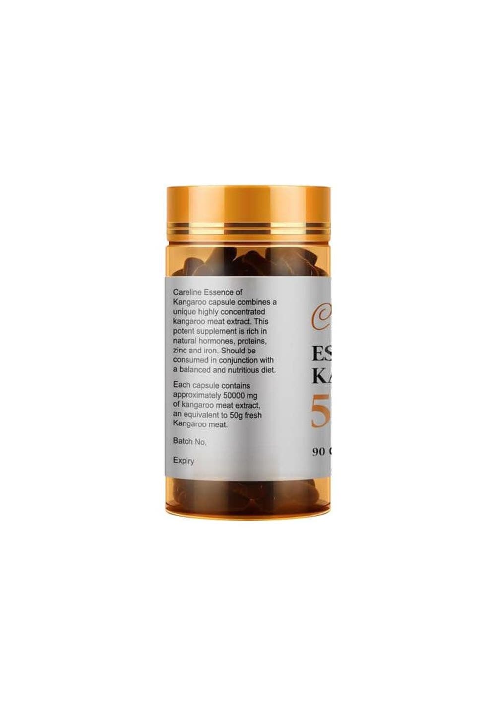 Description Australia Careline Essence of kangaroo 50000 90 Capsules combined a unique highly concentrated kangaroo meat extract. This product is rich in natural hormones, iron and zinc. Ingredient Each capsule contains approximately 50000 mg of kangaroo meat extract, an equivalent to 50g of fresh kangaroo meat. Directions To be consumed by adults only. Take one capsule with a meal per day, or directed by your healthcare professional. Store below 25°C Australian made.