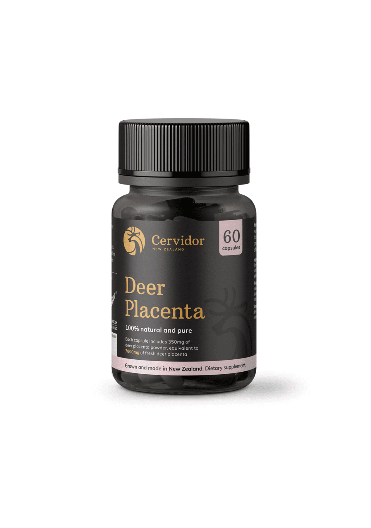 Cervidor is an expert and a global reference standard for deer products. We harness the strength and efficacy of free-range New Zealand Red Deer through a vertically integrated supply chain from the farm to the finished product. 100% natural and pure active ingredients guaranteed. Grown and Made in New Zealand 60 x 7000mg Capsules How it works: Cervidor Deer Placenta is a rich source of nutrients and growth factors. Oriental medicine beliefs consider Deer Placenta beneficial in: enhancing the skin renewal process reducing lines and bringing smoother, softer and velvety skin improving blood circulation assisting in burning excess body fats and firming up the body Ingredients: Each capsule includes 350mg of Deer Placenta Powder, equivalent to 7000mg of fresh Deer Placenta. No other ingredients, additives, fillers or recipients. Dosage: Adults-take 1-3 capsules daily with meals or as professionally directed. Always check with your doctor first if you are taking prescribed medicine. StorageÔºö Store in a cool dry place away from direct sunshine. Do not use it if the cap seal is missing or broken. Always check with your doctor first if you are taking prescribed medicine.