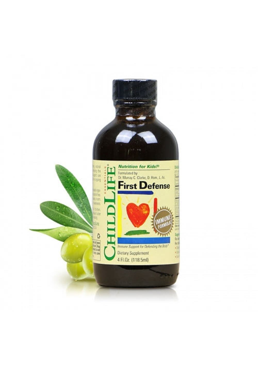 Childlife First Defense Immune Formula Description Nutrition for Kids!® Immune Support for Defending the Body ChildLife First Defense is a unique formula that supports your child's natural defenses and immune strength. Health Tip: for stimulating natural immune responses and defending the body. When needed for immune support, use daily at the recommended dosages. For ongoing maintenance, use once daily. Childlife uses only the highest quality ingredients. Directions For infants 6 mnths to 1 year: 1/2 Teaspoon 3 times daily.For children 1-12 years: 1 teaspoon 3 times daily. Give directly or mix with juice or your child's favorite drink. Shake well before using. Free Of Gluten, casein, alcohol, milk, eggs, yeast, wheat, corn, artificial colorings, flavorings and sweeteners. *These statements have not been evaluated by the Food and Drug Administration. This product is not intended to diagnose, treat, cure, or prevent any disease. Supplement Facts Serving Size: 1 Teaspoon (5 mL) Servings per Container: 24 Amount Per Serving % Daily Value Calories 10 Total Carbohydrate 2 g <1% Olive Leaf Extract (olea europea) 80 mg * St. John's Wort (hypericum perforatum) (leaf & flower) 20 mg * Larch Arabinogalactan (larix occidentalis) (tree) 15 mg * Zinc (gluconate) 3 mg 20% Silver (colloidal) 60 ppm * *Daily value not established. Other Ingredients: Purified water, glycerin, citric acid, grapefruit seed extract, stevia, potassium sorbate, gum arabic.