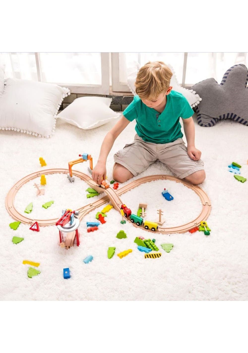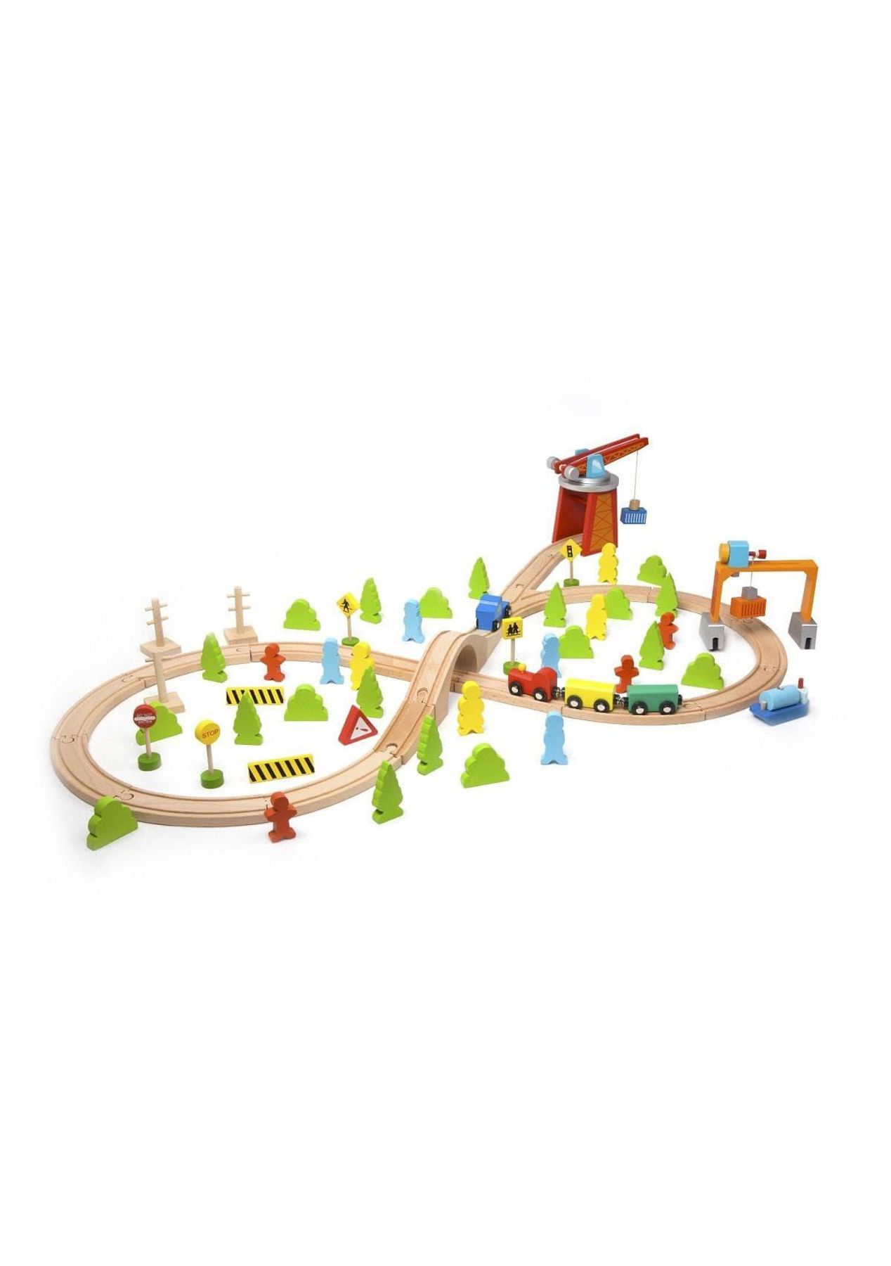 Description This 75-piece train set includes a variety of accessories, rotating crane and a tower crane. Children will have fun moving the cargo from the port, through the busy towns and into the city. This set helps children to develop their coordination and problem-solving skills as they move their train through the imaginary world of commerce. Features Dims: 46 x 27 x 22cmAge: 3+ YearsMaterials: Rubber Wood and Tea Wood