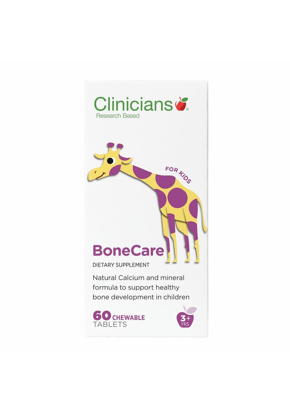 Description Clinicians BoneCare Kids contains a research based combination of vitamins and minerals needed to support healthy growing bones. The minerals in this formula are highly bioavailable and the calcium comes from Aquamin® , a red algae rich in trace mineral and shown to be better utilised than calcium carbonate (chalk) forms. This formula is suitable for pregnant and breastfeeding women and comes in easy-to-take tasty vanilla chews. Optimal bone health requires more than calcium and vitamin D. Many people are unaware that other key minerals like magnesium, boron, zinc and manganese are also required as part of bone structure or are needed to support mineral utilisation or entry into the bone. Vitamins D is also required to support this process. Ingredients Aquamin® (from Calcified Lithothamnion species - Red Algae) 416mg Equiv. Calcium 125mg Trimagnesium citrate (equiv. Magnesium 50mg) 322mg Zinc amino acid chelate (equiv. Zinc 2.5mg)12.5mg Manganese amino acid chelate (equiv. Manganese 500mcg) 2.5mg Boron citrate (equiv. Boron 375mcg) 7.5mg Cholecalciferol Complex (equiv. Vitamin D3 33.75mcg) 1.5mg Aquamin® also contains trace minerals typically consisting of the following per tablet: Boron 12mcg Copper 2mcg Iodine 12mcg Iron 250mcg Magnesium 9mg Manganese 27mcg Potassium 1.7mg Silicon 500mcg Sodium 1.2mg Strontium 700mcg Sulphur 2.2mg Zinc 5mcg Also contains: Tableting aids. No added: Artificial colours or preservatives. Suggested Use Children 3-8: Chew 1 tablet per day. Children 9-13: Chew 1-2 tablets per day. Children 14-18: Chew 1-3 tablets per day. Adults: Chew 2-4 tablets per day. Additional Product Information Warnings: Adult supervision require when given to smaller children. Tablets can be broken into smaller pieces.