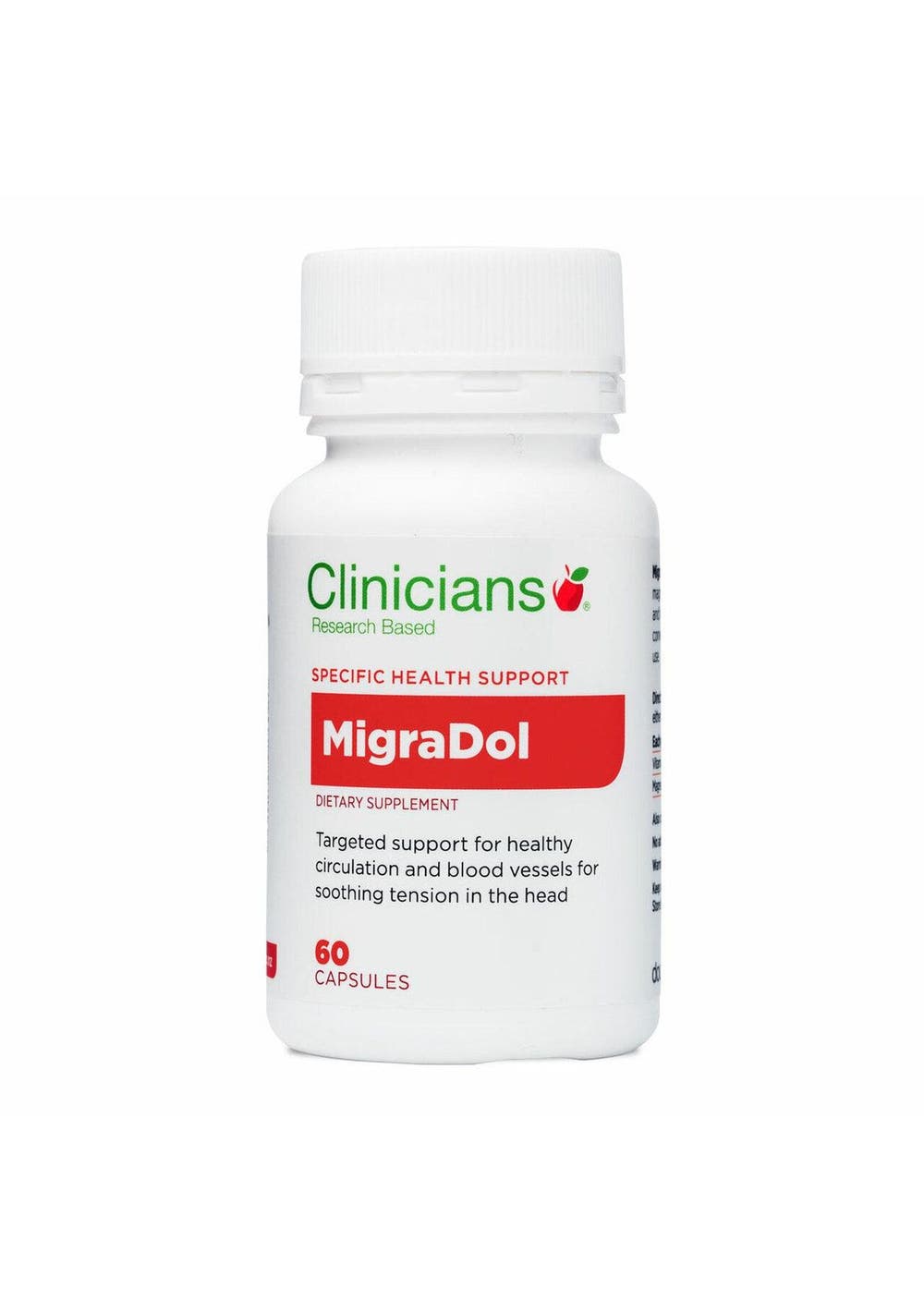 Description Clinicians MigraDol provides support for helping to relax tense muscles in the head, healthy circulation and blood vessel health. It is suitable for immediate and long-term use and is suitable for use alongside conventional medication. TAPS CH4885 Clinicians MigraDol contains Vitamin B2 (riboflavin) which may assist with energy production to support blood vessel health in the head. Ingredients Each capsule contains: Vitamin B2 (as riboflavin) 133mg Magnesium (from magnesium aspartate complex) 133mg Also contains: Magnesium stearate, silicon dioxide. No added: Gluten, dairy, yeast, sugar, artificial colours or preservatives. Directions Adults: Take 3 capsules daily with food, either together or in divided doses, or as directed. Precautions Clinicians MigraDol contains vitamin B2 which causes a harmless change in urine colour to intense yellow. This effect disappears within 24 hours of stopping vitamin B2 supplementation. High doses of magnesium may loosen the bowel i.e. (doses exceeding 500mg daily). If uncomfortable, reduce the dose until bowel movements stabilize or spread the dose out during the day. The threshold dose at which this occurs may vary amongst individuals. High dose vitamin B2 may occasionally result in transient diarrhoea and frequent urination if this occurs lower the dose. Pregnancy & Breastfeeding: Clinicians MigraDol is well tolerated and considered suitable for use during these times, use under health professional supervision to ensure appropriate dosing.
