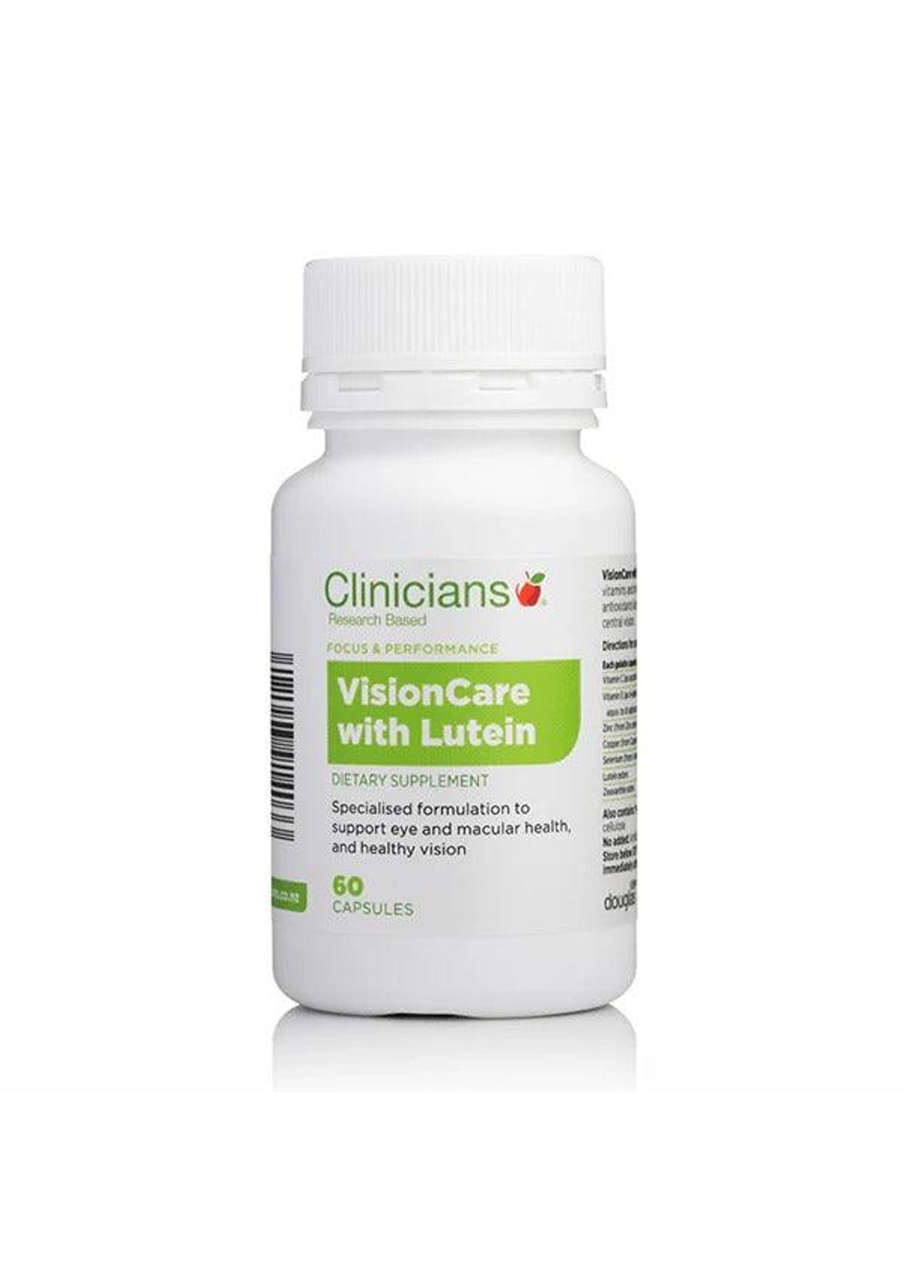 Description Clinicians VisionCare with Lutein is a scientifically validated synergistic antioxidant formula specifically designed to support eye and macular health and healthy vision. Containing Xangold® and Optisharp™ derived from marigold flowers which provide the antioxidants, lutein and zeaxanthin to support the integrity of eye tissue. Ingredients Active Ingredients in each capsule: Ascorbic acid (Vitamin C) 250 mg d-alpha-tocopherol succinate (natural Vitamin E) 85mg (200 IU) Copper (from copper gluconate) 1mg Selenium (from L-selenomethionine) 20 mcg Zinc (from zinc amino acid chelate) 7.5 mg Lutein esters (from a base of Xanagold ® 10%) 5mg Zeaxanthin esters (from a base of Xangold ® 10% & Optisharp™ 5%) 1 mg Also contains: magnesium stearate, silicon dioxide and microcrystalline cellulose. No added: gluten, dairy, yeast, sugar, artificial colours, sweeteners, flavours or preservatives. Suggested Use Adult: Take 1 capsule twice daily with food. Additional Product Information Warning: Pregnancy and Breastfeeding: When taken at the recommended dose Clinicians VisionCare with Lutein is well tolerated and suitable to take during pregnancy and breastfeeding. This product contains selenium which is toxic in high doses. A daily dose of 150 micrograms for adults of selenium from dietary supplements should not be exceeded.