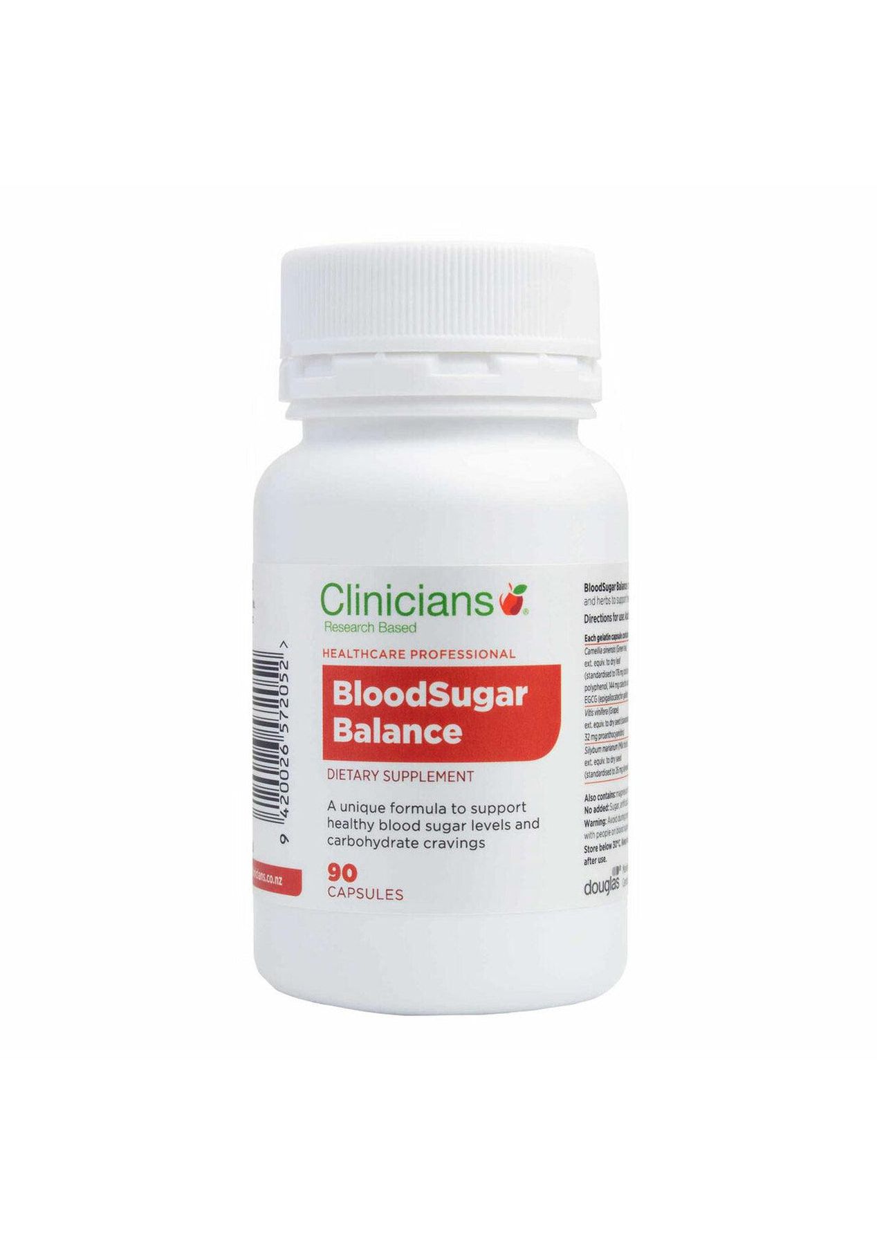 Description Clinicians BloodSugar Balance provides essential nutrients to support healthy blood sugar levels and carbohydrate metabolism. Clinicians BloodSugar Balance contains Milk Thistle which may support healthy liver function to assist the liver metabolising carbohydrates. Provides a unique combination of herbs to help manage free radicals and support hepatic, glucose metabolism. Ingredients Each Capsule Provides:Camellia sinesis (green tea) ext. equiv. to dry leaf 14.4gm standardised to not less than 176mg total tea polyphenol, 144mg catechin and 90mg EGCG (epigallocatechin gallate)Vitis vinifera (grape) ext. equiv. to dry seed 4gm standardised to not less than 32mg of proanthocyanidinsSilybum marianum (milk thistle) ext. eguiv. to dry seed 2.3gm standardised to not less than silymarin 27mgCinnamonum cassia (Cinnamon) ext. equiv to dry bark 340mgCurcumin 15mgChromium picolinate (equiv. chromium 167mcg) 1.3mgMagnesium citrate (equiv. magnesium 33mg) 215mgZinc amino acid chelate (equiv. zinc 5mg) 25mgAlso contains: Magnesium stearate, microcrystalline cellulose and silicon dioxide.No Added: Gluten (or wheat), dairy, yeast, sugar, artificial colours, sweeteners, flavours or preservatives. Suggested Use Adults: Take 1 capsule 2 to 3 times daily with food. Additional Product Information WarningsÔºö Clinicians BloodSugar Balance is well tolerated at the dose recommended. Check with your health professional before using in individuals on blood sugar lowering medications, as Clinicians BloodSugar Balance may affect control of blood sugar levels. Blood sugar levels should be monitored particularly in the first one to two months as medication requirements may change. Exercise caution as curcumin may stimulate the gallbladder in people with gallbladder disease. Pregnancy & Breastfeeding: Avoid in pregnant or breastfeeding women as there is insufficient safety information on the herbs (cinnamon, grape seed and milk thistle) to recommended supplementation during this time. People with diagnosed diabetes should check with their doctor as blood sugar levels could be altered when using this product.