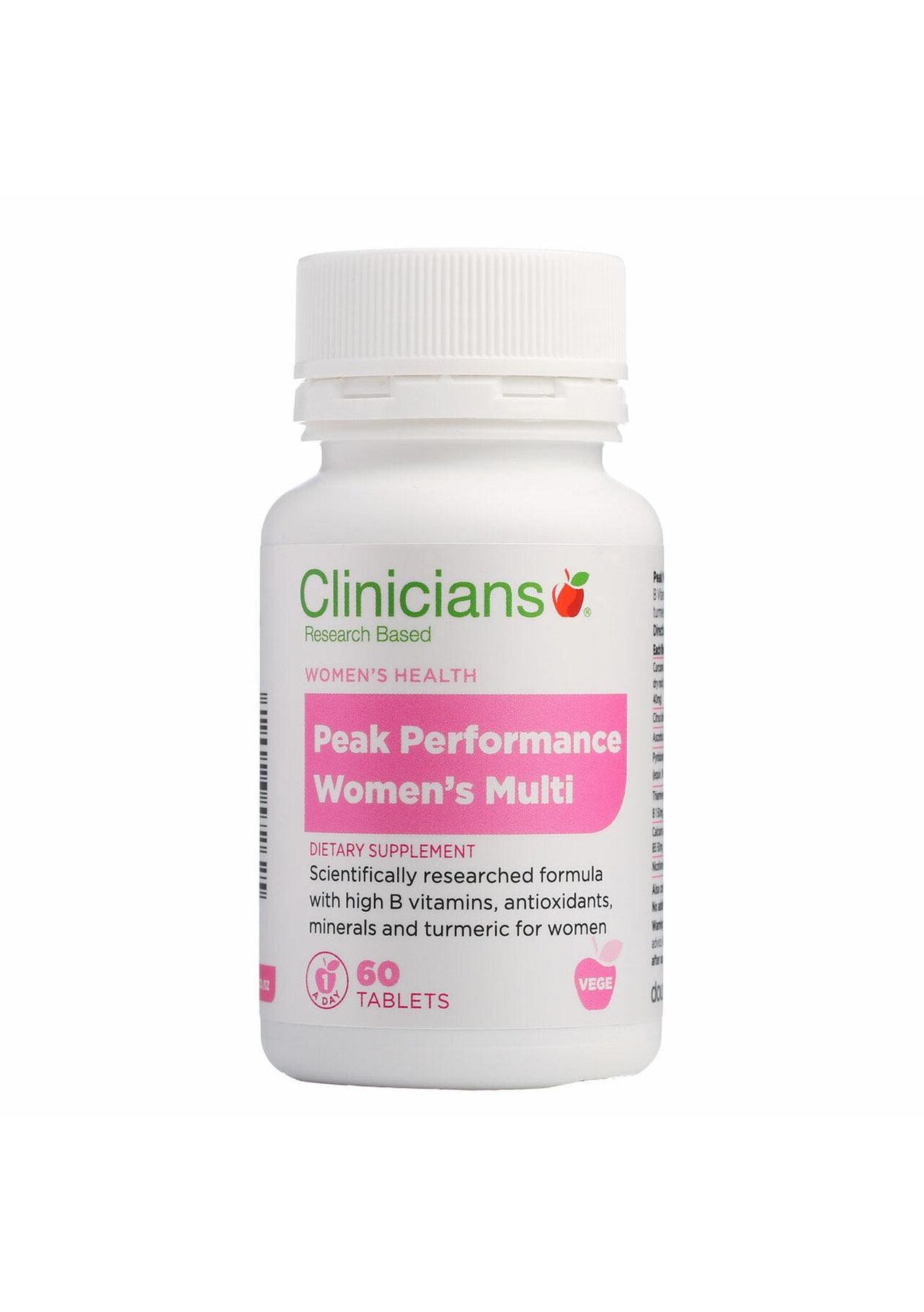 Description Clinicians PeakPerformance Women’s Multi Vitamin provides an everyday boost of essential nutrients for optimal peak performance for women of all ages. With high dose B-group vitamins to help to lift energy and balance life’s stresses and antioxidants for healthy ageing and immune support. All nutrients are included at levels statistically shown to have health benefits. The PeakPerformance Multi contains Selenium, Iodine, and Zinc, all known to be deficient in NZ soils. It also contains Vitamin D (Vitamin D deficiency is common in NZ). Ingredients Each Tablet Provides:Curcuma longa (turmeric) ext. equiv. to dry root 200mg (standardised to curcuminoids 40mg)Citrus bioflavanoids 150mgThiamine hydrochloride (vitamin B1 50mg) 56mgRiboflavin (vitamin B2) 50mgNicotinamide (vitamin B3) 50mgCalcium pantothenate (vitamin B5 50mg) 55mgPyridoxine hydrochloride (vitamin B6 50mg) 61mgCyancobalamin (vitamin B12) 50mcgAscorbic acid (vitamin C) 150mgCholecalciferol (vitamin D3 600iu) 15mcgFolic acid 300mcgBiotin 150mcgPotassium iodide (iodide 150mcg) 196mcgZinc amino acid chelate (zinc 10mg) 50mgL-Selenomethionine (selenium 26mcg) 5.2mgAlso Contains: Tabletting aids. No Added: Gluten, wheat, dairy, yeast, artificial colours, artificial sweeteners, flavours or preservatives. Suggested Use Adults: Take 1 tablet daily. Additional Product Information Warnings: Peak Performance Women’s Multi is considered safe and well tolerated at the dose recommended. Exercise caution in individuals with gallbladder dysfunction as curcumin may cause gallbladder contractions similar to those experienced with a fatty meal. Pregnancy and Breastfeeding: Clinicians PeakPerformance Women’s’ Multi may be taken at these times.