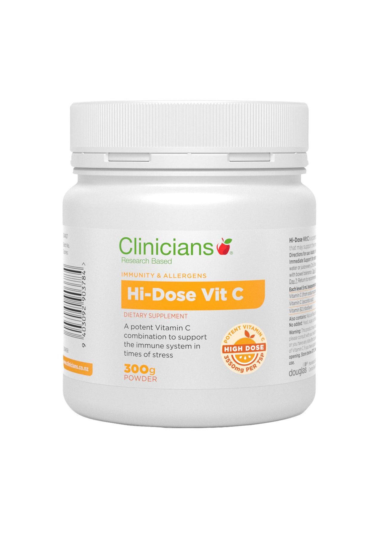 Description Clinicians Hi-Dose Vit C Powder is a potent formulation containing two forms of Vitamin C that may support the immune system in times of stress. Each teaspoonful provides a high 3550mg dose of Sodium ascorbate and Ascorbic acid, buffered forms that are well tolerated and easily absorbed by the digestive tract. Hi-Dose Vit C can be taken every 2-3 hours when ills and chills strike to provide acute support to the immune system. Studies show Vitamin C absorption is greatly increased in individuals when they are unwell before reaching bowel tolerance and provoking side effects. This is due to increased support required for immune system function. Hi-Dose Vit C is also appropriate for daily use as it supports stress hormone production from the adrenal glands during times of stress. Ingredients Active ingredients per 5ml level teaspoon: Vitamin C (from sodium ascorbate) (equiv. Sodium 372mg) 2850mg Vitamin C (ascorbic acid) 700mg Vitamin B2 (riboflavin) 3mg Also contains: Natural flavourings and Thaumatin. Suggested Use Adults: 1 level teaspoon in water or juice 1-2 times daily. Immediate Support (for short term adult use only): Day 1-3: Mix 1 level teaspoon in water or juice every 2 to 3 hours during waking hours. Monitor dosage in acccordance with bowel tolerance. Day 4-7: Mix 2 level teaspoonsful twice or three times daily. After Day 7: Return to recommended adult dosage or as directed by your health professional. Additional Product Information WarningsÔºö This product may cause bowel looseness. If you are on any medication, please consult with your health professional before taking this product. If symptoms persist or you have any side effects please contact your health professional. Do not take high doses of Vitamin C if you have a gastric ulcer or ulcerative colitis. Considered suitable for use during pregnancy and breastfeeding.