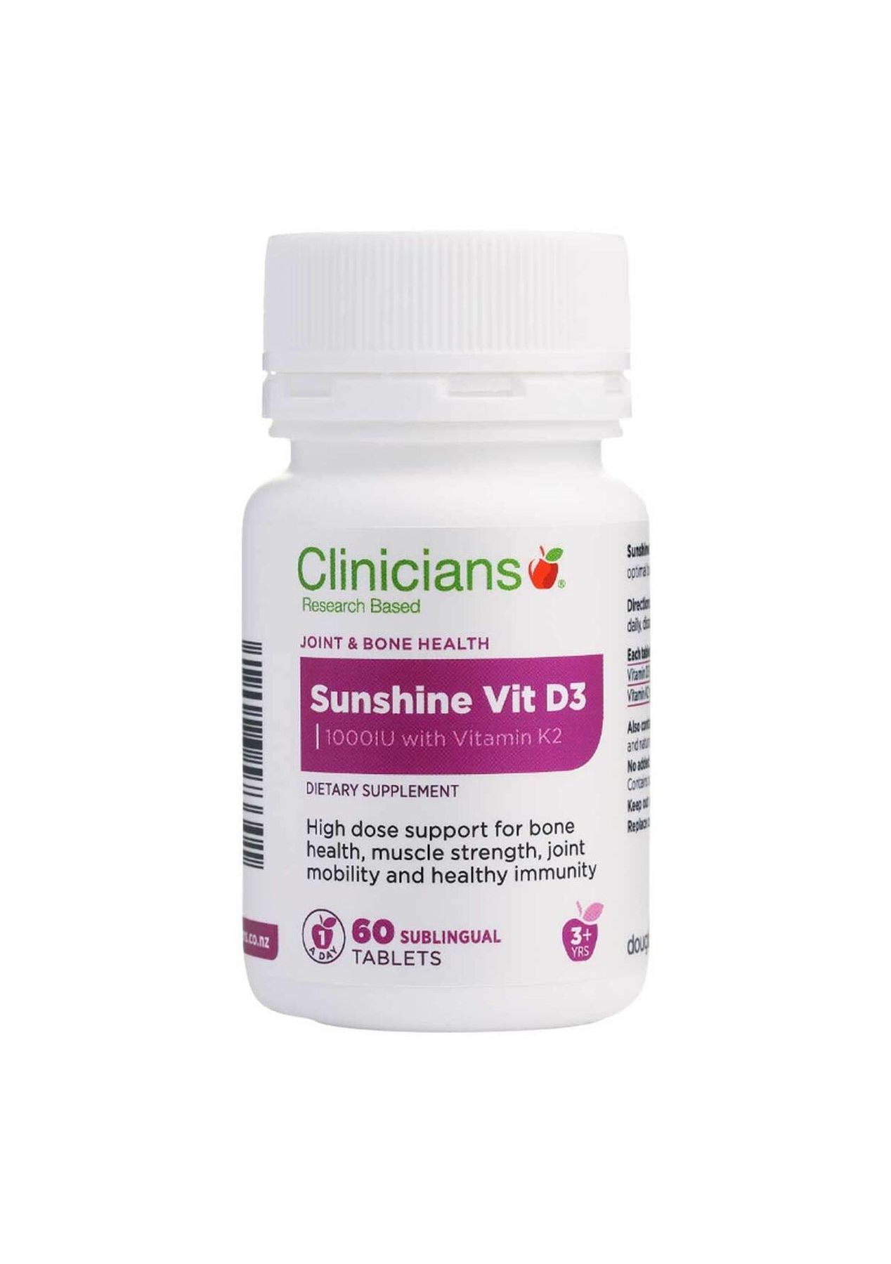 Description Clinicians Sunshine Vitamin D3 with Vitamin K2 provides a synergistic combination of Vitamin D3 and K2 for essential daily support for optimal bone health, muscle strength, joint mobility, and immunity. Suitable for the whole family! Vitamin D3 and K2 have both synergistic roles in the body to support bone mineral density and everyday immune, muscle, joint, and heart health. K2 is an essential cofactor for Vitamin D metabolism. Ingredients Each Sublingual Tablet Provides: Vitamin D3 (cholecalciferol 1000IU) 25mcg Vitamin K2 (menaquinone MK7) 90mcg Also Contains: Xylitol, sorbitol, vegetable stearate, silica, cellulose and natural flavour. Contains Soy.No added: Gluten, dairy, yeast, sugar, artificial colours, sweeteners, flavours or preservatives. Suggested Use Adults and children over 3 years of age: Take 1 tablet daily, dissolved under the tongue or as professionally advised. Additional Product Information Warnings: Vitamin D is considered well tolerated when daily intakes do not exceed the recommended dose. Use with caution in individuals with high calcium levels, primary hyperparathyroidism or disorders of calcium metabolism Use with caution in individuals on anticoagulant medications, monitor INR levels particularly in the 1st two weeks of therapy. Vitamin K doses of 100mcg/ day do not appear to interfere with warfarin and may actually help stabilize and reduce INR fluctuations (INR – International Normalised Ratio). Pregnancy and Breastfeeding: Considered suitable when Vitamin D intake does not exceed the tolerable upper intake and Vitamin K does not exceed the recommended daily intake of 90mcg/ day for women aged 19 – 50 years