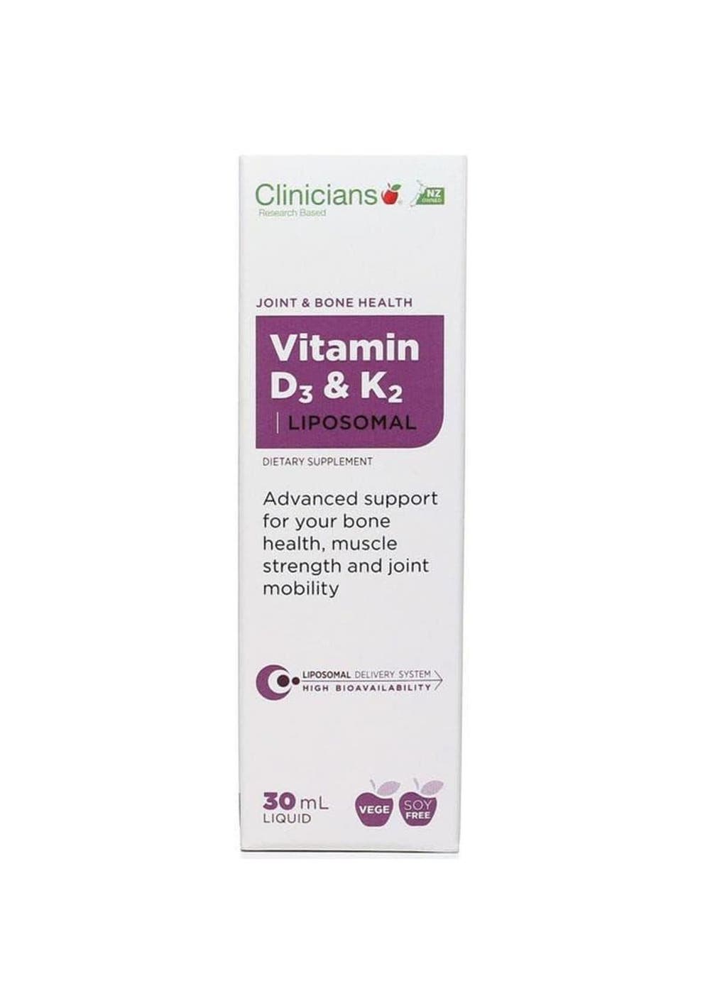 Description This liposomal formula contains the forms of Vitamin D3 and K2 most usable to the body. These forms have been scientifically shown to work synergistically together to support bone health than either ingredient alone . Vitamin D is particularly prone to oxidation, so using liposomal technology we can improve its stability and make it more bioavailable. Ingredients Each serve of 0.5ml contains:Vitamin D3 (cholecalciferol) 500IU, equivalent to 12.5mcg;Vitamin K2 (menaquinone MK-7) 45mcgAlso contains: Purified water, glycerin, structured sunflower seed lecithin (providing essential phospholipids including phosphatidylcholine), natural fruit flavours, acacia gum, xanthan gum, potassium sorbate.No Added: Gluten, dairy, sugar, artificial colours, sweeteners and flavours. Suggested Use One serve = 0.5ml (10 drops) Adults: 1 to 2 times daily Children over 4 years: Once daily Best taken 15 minutes away from food. You can dilute to taste with a small amount of water or juice Additional Product Information Warning: Precautions & Contraindications: Not to be taken if on blood thinning therapy, without medical advice. Avoid in hypersensitivity to Vitamin D.Considered well tolerated.Suitable for pregnant and breastfeeding women.