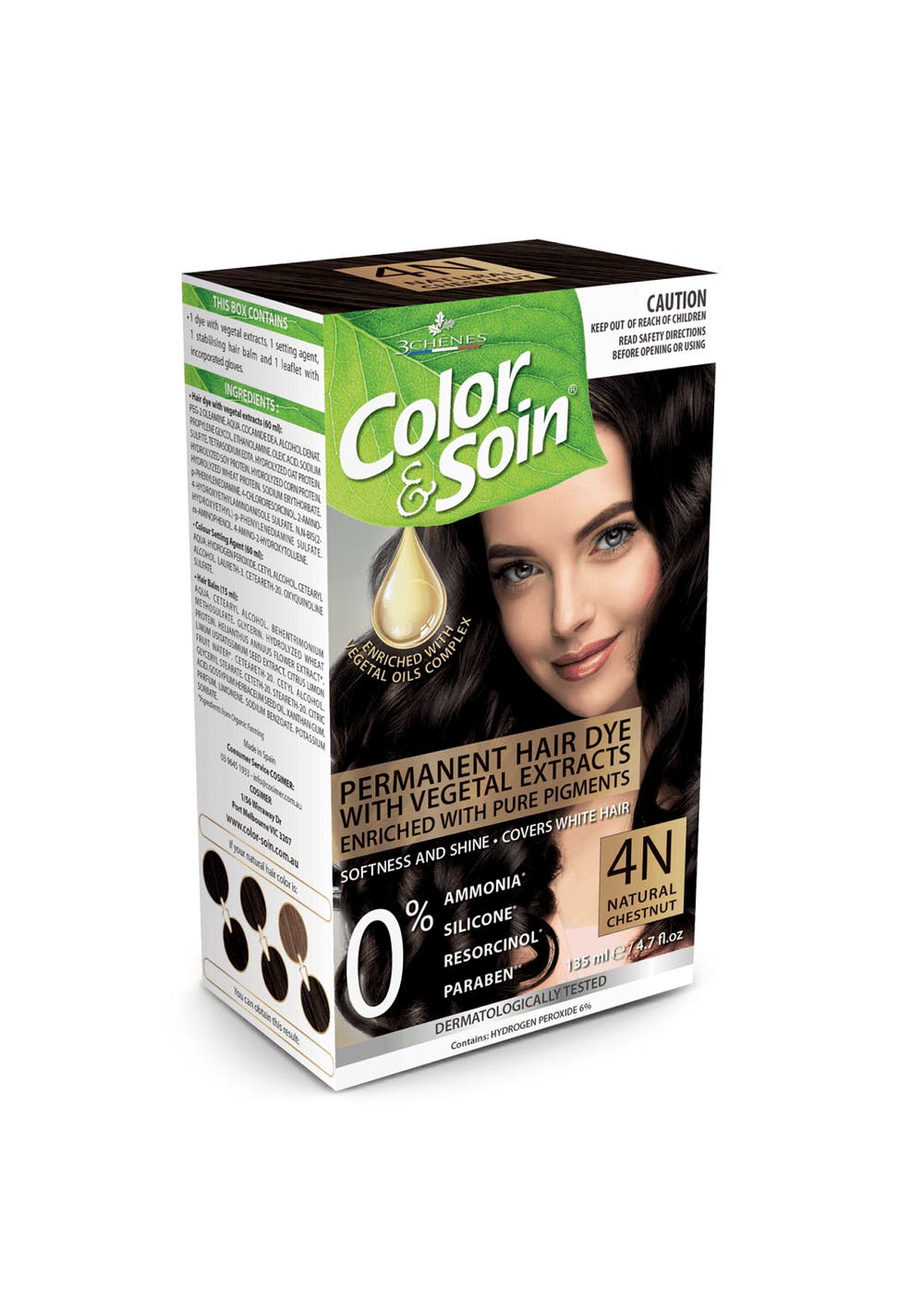 Description included: 1 permanent hair dye with vegetal extracts 1 setting agent 1 stabilising hair balm 1 pair of gloves and instructions for use. Benefits Highly concentrated in pure pigments (99%), long lasting, UV and chlorine resistant, it covers 100% of grey hair from the first use. With its special formulated oil-protein complex that preserves keratin and natural oils of hair, Color & Soin gives you maximum protection and nutrition for supple, shiny and soft hair. It is perfect for women with sensitive or fragile scalp. Free from ammonia, silicone, resorcinol, paraben and SLS. Dermatologically tested. Key Ingredients Hair Dye With Vegetal Extracts (60ml): Peg-2 Oleamine. Water/Aqua. Cocamide Dea. Alcohol Denat. Propylene Glycol. Ethanolamine. Oleic Acid. Sodium Sulfite. Tetrasodium Edta. Hydrolyzed Oat Protein. Hydrolyzed Soy Protein. Hydrolyzed Corn Protein. Hydrolyzed Wheat Protein. Sodium Erythorbate. P-Aminophenol. P-Phenylenediamine. 2-Methylresorcinol. 4-Chlororesorcinol. 4-Amino-2-Hydroxytoluene. Colour Setting Agent (60ml): Water/Aqua. Hydrogen Peroxide. Cetyl Alcohol. Cetearyl Alcohol. Laureth-3. Ceteareth-20. Oxyquinoline Sulfate. Hair Balm (15ml): Water/Aqua. Cetearyl Alcohol. Glycerin. Behentrimonium Methosulfate. Citrus Limon (Lemon) Fruit Water*. Hydrolyzed Wheat Protein. Helianthus Annuus (Sunflower) Flower Extract. Linum Usitatissimum (Linseed) Seed Extract*. Ceteareth-20. Cetyl Alcohol. Glyceryl Stearate. Ceteth-20. Steareth-20. Citric Acid. Gossypium Herbaceum (Cotton) Seed Oil. Xanthan Gum. Fragrance (Parfum). Limonene. Sodium Benzoate. Potassium Sorbate. Please Note: Each Colour May Differ, please refer to the package. How To Use PREPARATION: Before application, place a towel over your shoulders and put on the gloves attached to the instructions leaflet. Empty the contents of the Color & Soin hair dye into the applicator bottle containing the colour setting agent. Replace the applicator nozzle and shake the bottle until perfectly blended. APPLICATION: Apply to dry, unwashed hair. Unscrew the applicator nozzle and apply the product immediately after mixing it. Work it through all of your hair, starting from the roots. Leave to act for 20 to 40 minutes depending on how much grey hair you have. RINSING AND CARE: Before rinsing, emulsify the product with a bit of warm water and massage in circular movements. Rinse thoroughly and apply the Color & Soin Hair Balm (included) by gently massaging on wet hair for 2 minutes. Rinse out.