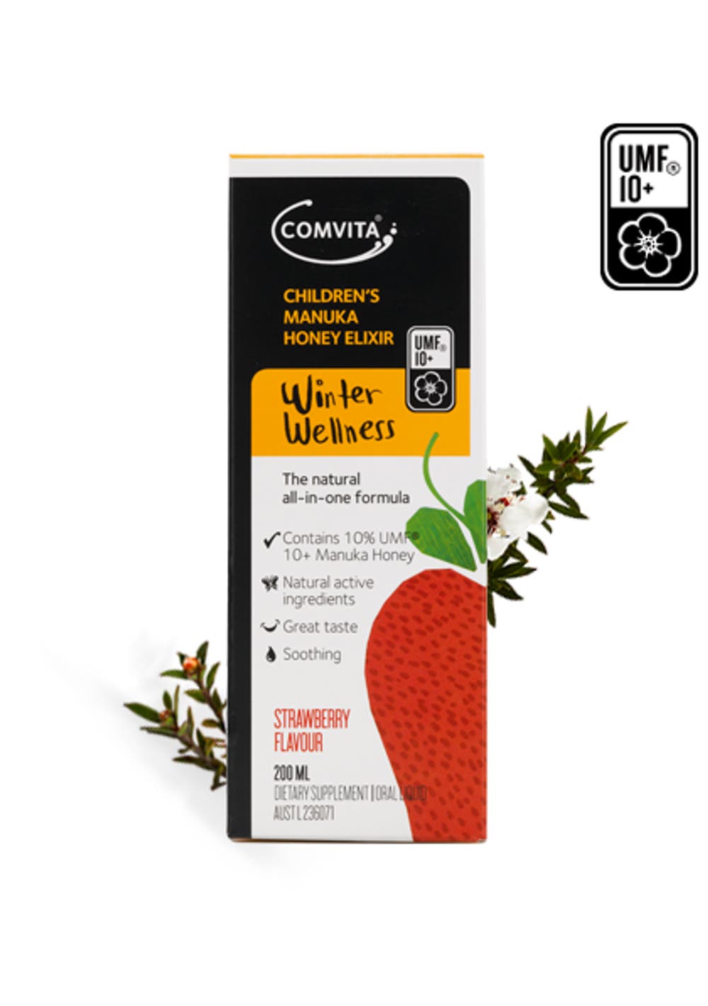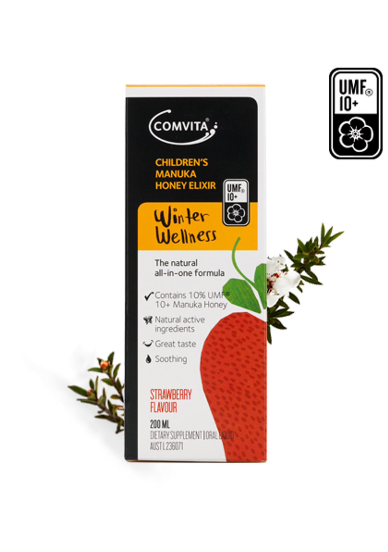Comvita Children's Manuka Honey Elixir supports immune defences during winter. The active ingredients make this product ideal for children over two years of age. It contains no artificial sweeteners or preservatives. New Zealand Manuka has long been valued for its health-maintaining effects and Manuka Honey is gaining worldwide recognition for its unique properties. Propolis contains high levels of bioflavonoids and supports the immune system. Echinacea has immune supporting properties that have been found to assist good health. Directions Children: Take 10mL (2 teaspoonfuls) every 2 to 3 hours as required. Take up to 40mL daily. Not to be given to children under 2 years of age without medical advice. WARNING: Propolis may cause severe allergic reactions. If irritation or swelling of the mouth or throat occurs, discontinue use and consult a healthcare practitioner. Ingredients Multiflora Honey, Purified water, UMF® 10+ Manuka (Leptospermum scoparium) Honey (10%), Apple (Malus spp) cider vinegar, Propolis extract (contains Propylene glycol [bulking agent]), Echinacea (Echinacea purpurea) extract (contains silicon dioxide [anticaking agent]), Strawberry flavour, Cochineal (colour), Xanthan gum (thickener), Fennel (Foeniculum vulgare) oil. Contains fructose, glucose and sucrose from honey.