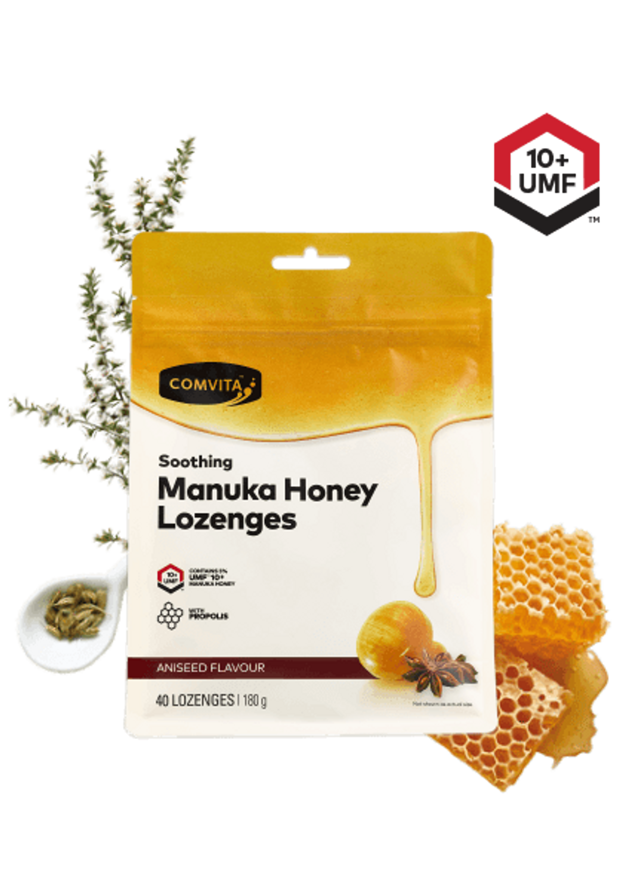 Mānuka Honey Lozenges Aniseed Soothing UMF™ 10+ Mānuka honey lozenges with bee propolis Try the soothing taste of Mānuka honey lozenges aniseed flavoured. They are made with genuine UMF™ 10+ Mānuka honey from New Zealand. Mānuka honey is rare and unique with well-known properties. Bee propolis is created by bees to protect their own hives and contains high levels of active bioflavonoids . Add some aniseed and it tastes great. Ingredients: Sugar, Glucose Syrup, UMF™ 10+ Manuka Honey (5%), Propolis Tincture, Natural Flavours. Dissolve one lozenge slowly in the mouth. PREGNANT OR LACTATING WOMEN: Consult your healthcare practitioner before use. Not suitable for children under 5 years of age. WARNING: This product contains Propolis which can cause severe allergic reactions. If irritation or swelling of the mouth or throat occurs, discontinue use and consult a healthcare practitioner. UMF™ stands for ‘Unique Mānuka Factor.’ This is a quality assurance trademark that measures the unique type of activity naturally present in Manuka honey. To get a license from the UMF™ Honey Association every producer has to meet strict criteria and their honey is independently tested and certified by independent laboratories. Comvita is license holder #1019. When you see that the honey has a UMF™ trademark, you can be certain you are holding genuine New Zealand Mānuka honey. Sometimes, nature works a little harder for you. Genuine UMF™ Mānuka honey has three potent compounds – Methylglyoxal (MGO), Leptosperin and Dihydroxyacetone (DHA). Some of our honey has more of that goodness than others. The UMF™ rating makes it easy for you to see which of our honey contains higher concentrations of these powerful bioactive properties. The greater the UMF™ Mānuka honey grade, the higher the concentration. Genuine Mānuka honey is one of nature’s rare and powerful wonders, renowned the world over for its beneficial properties. It contains a unique range of oligosaccharides and prebiotics, amino acids, polyphenolic and other plant-derived compounds.Great as a wellness morning ritual, pre-workout natural energy source or as a DIY skin-brightening facemask. Smooth and creamy, it tastes yummy too.