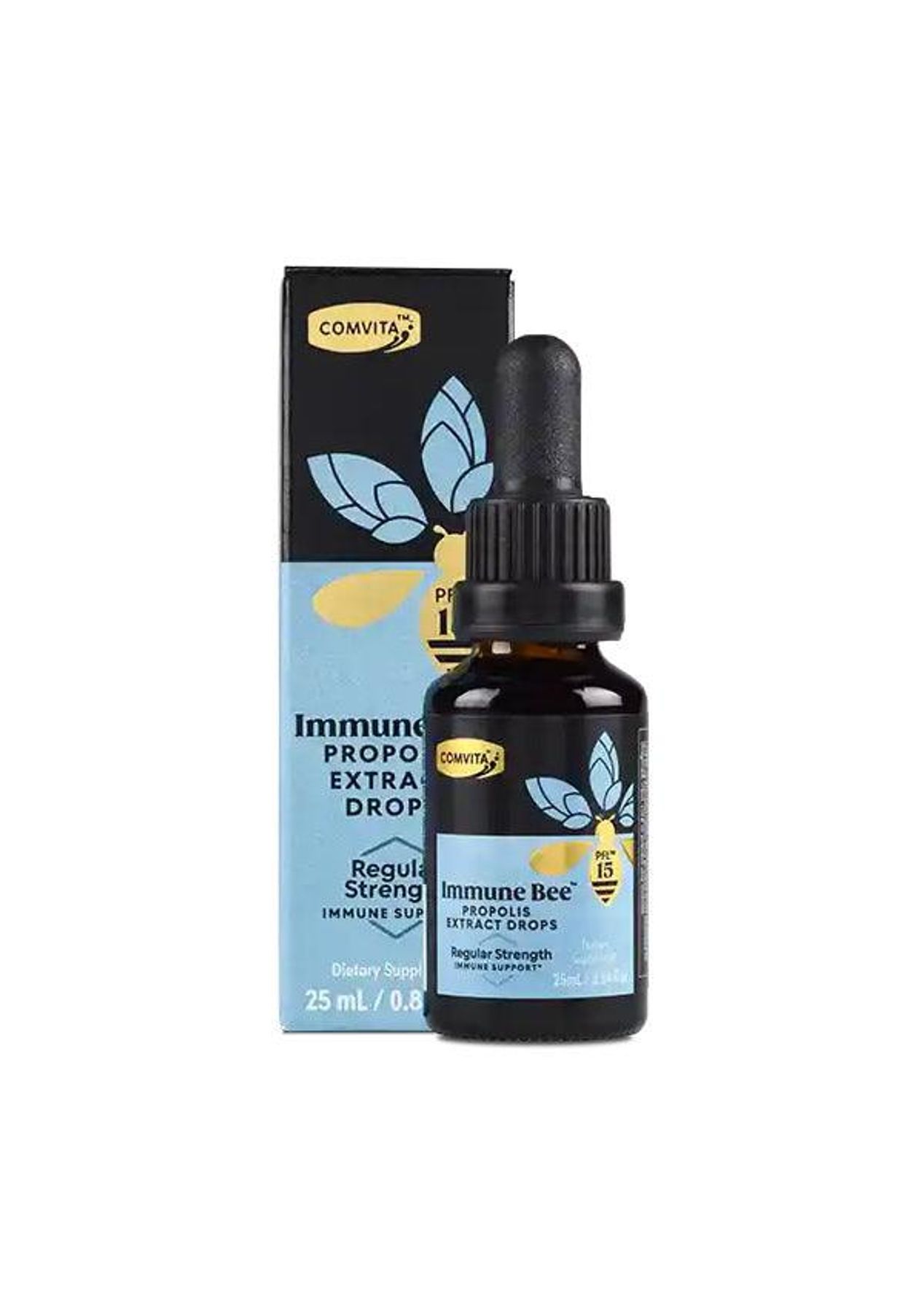 Description Comvita Immune Bee™ Propolis Extract contains the powerful natural immune support of bee propolis in an easy-to-use liquid format. For immune support and Oral Health. Honeybees are clever. They make bee propolis by collecting resin from trees and combining it with beeswax and enzymes to seal and protect the hive. Bee Propolis originates from a plant’s immune system and contains over 300 natural, bioactive compounds, flavonoids and phenolics (potent antioxidants) that work at the cellular level to fight free radicals and support the body’s immune system, naturally.Immune Bee propolis PFL15 Regular Strength Extract Drops have been specially formulated to provide a regular strength, daily dose of bee propolis for antioxidant support, immune function support, oral health or skin repair in a convenient liquid. Ingredient Pure Propolis Extract, Propylene glycol. Direction IMMUNE SUPPORT: Mix 1mL (1/4 tsp) in warm water and swallow twice daily.ORAL HEALTH: Mix 0.5mL (1/8 tsp) in water, rinse around mouth and swallow twice daily.SKIN SUPPORT: Can be used topically, if desired.Use Immune Bee for at least 20 days to realise benefits.